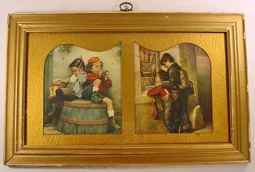 EARLY FRAMED PAIR OF PRINTS - CHILDREN - Incl. Child wearing a spiked helmet. Approx. 16.25" by 10.25". Condition issues to frame.