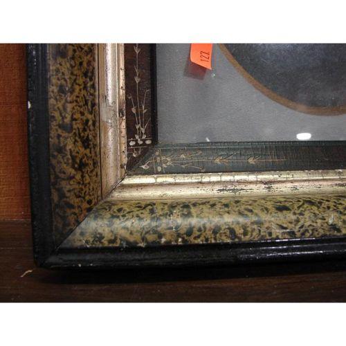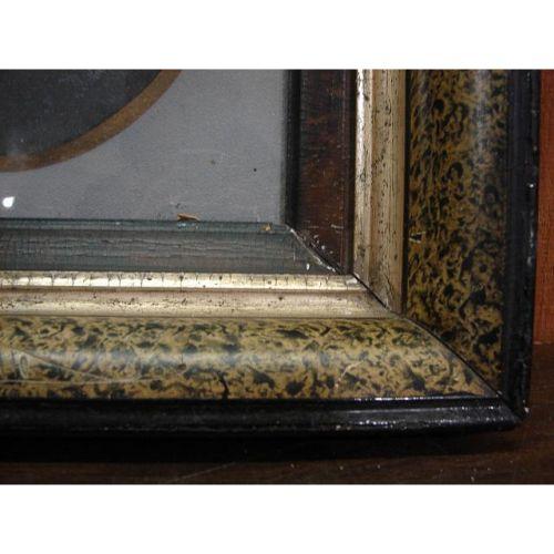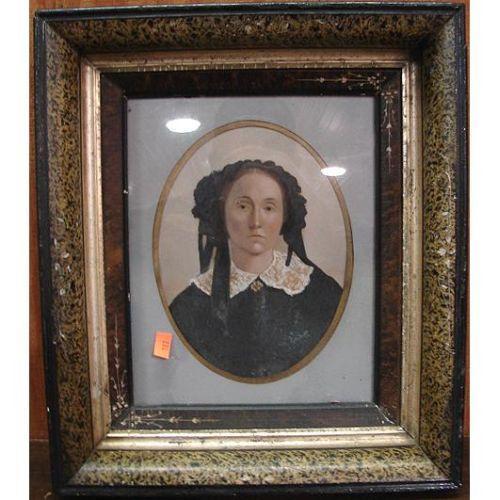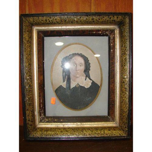 EARLY FRAMED WATERCOLOR PAINTING. Early 20th century painting depicts a woman in period clothing. Painting is under glass in a ebonized and gilded etched wooden shadowbox frame. 10” x 8”