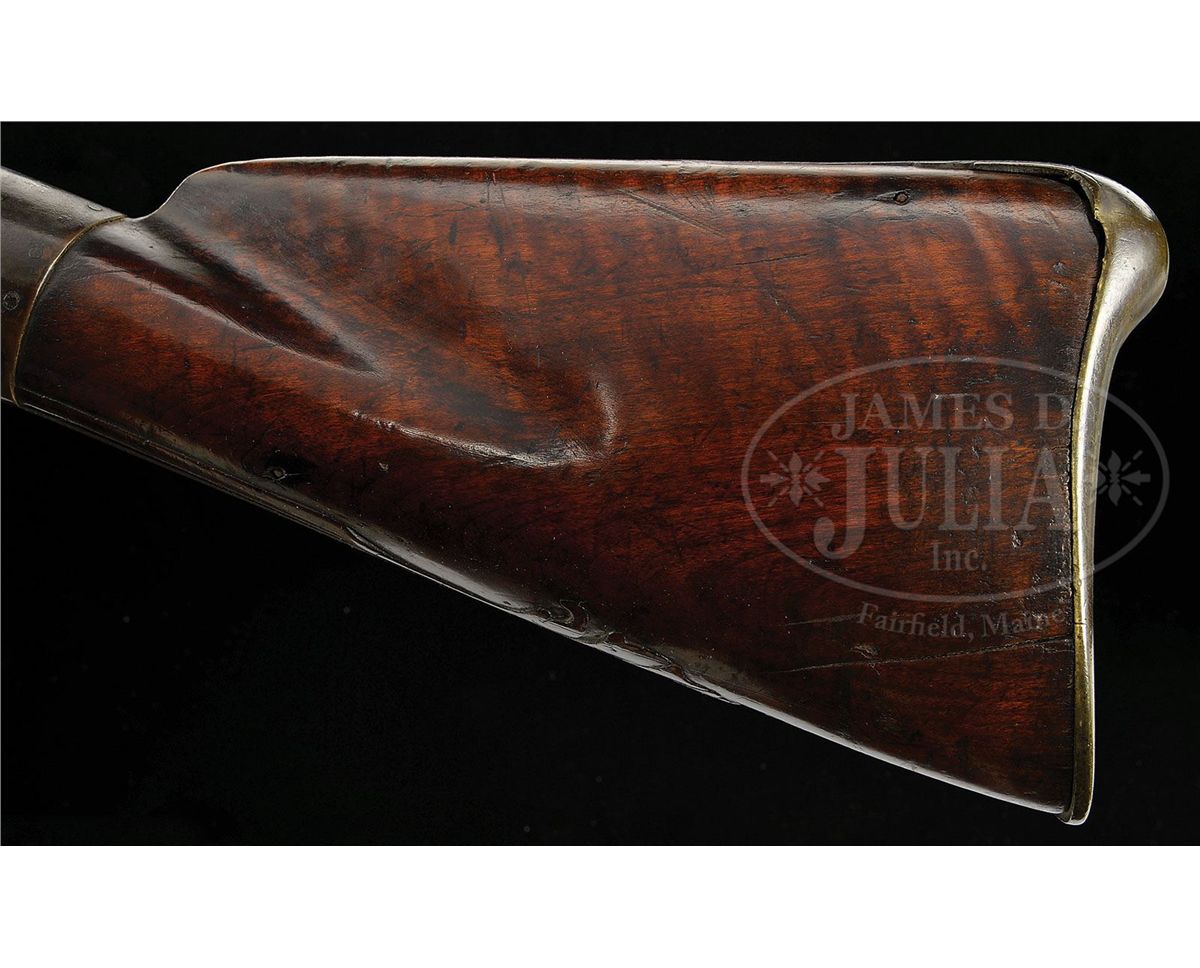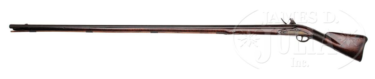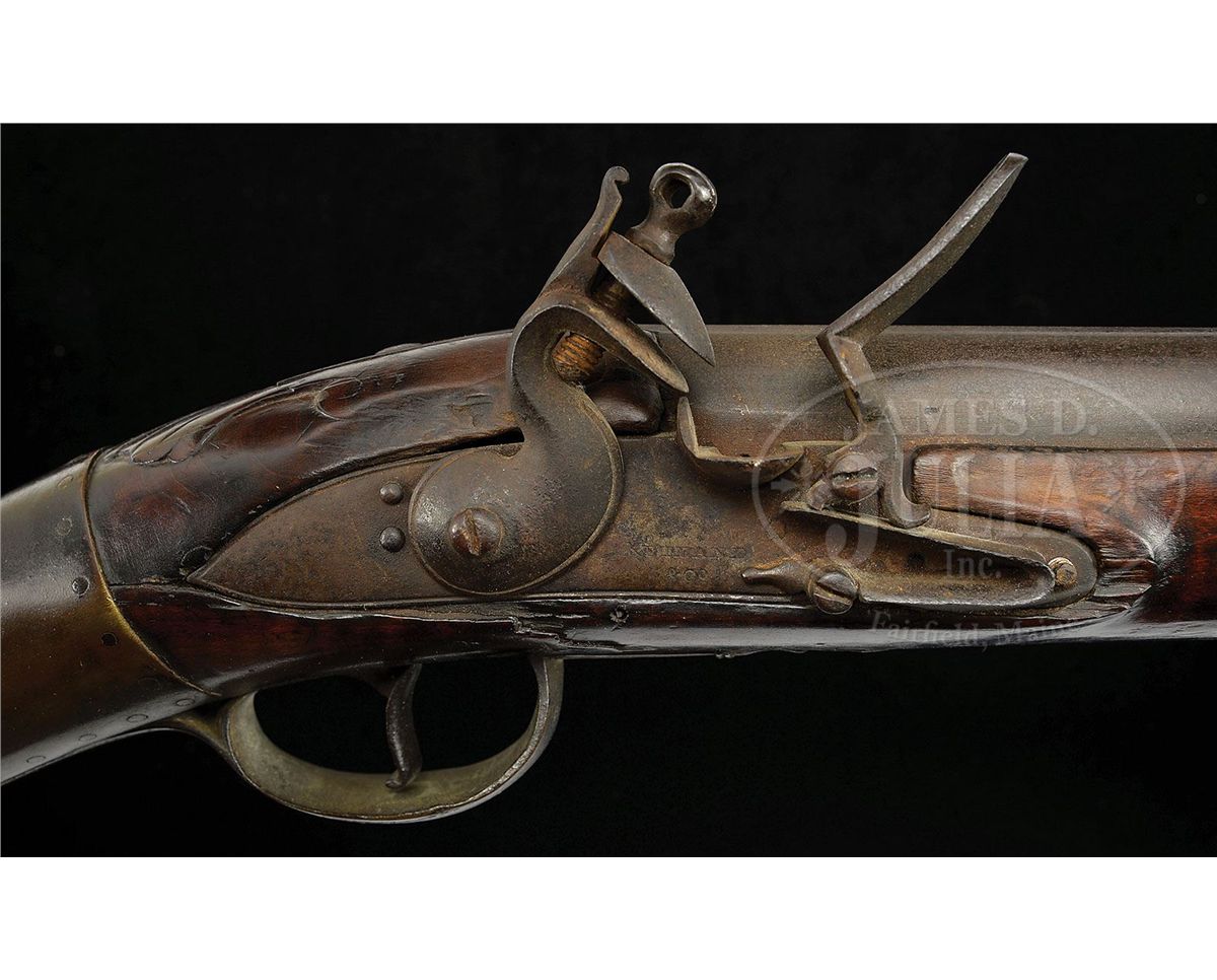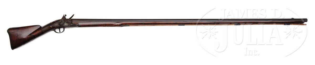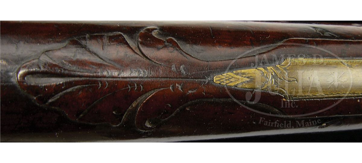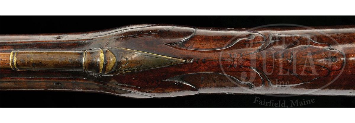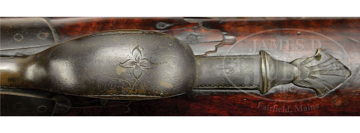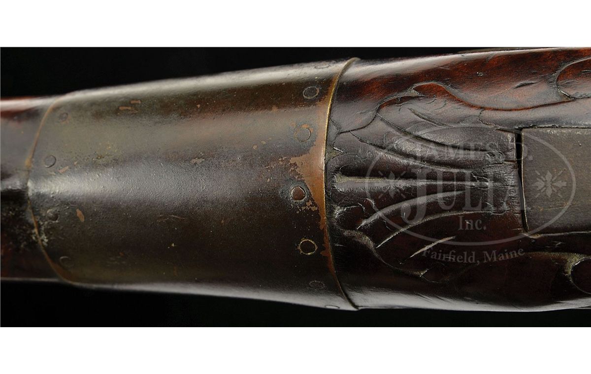 NSN. This outstanding fowler has a 60 ½ inch long flared barrel and an overall length of 77 inches. The barrel has early British “I.O.” barrel proofs under a sunburst or asterisk design. The full length curly Maple stock has high, bold, crisp relief carving at the rear entry ramrod pipe, behind the trigger guard and behind the barrel tang with nicely paneled fore stock wood. The early convex-shaped Ketland & Company English lock is marked in block letters and appears to be still in original flint condition. Very few of these Hudson Valley fowlers have survived in this condition and with curly Maple stock. CONDITION: This fowler is in unusually good condition with only a small three inch sliver of wood missing on the right hand side at the muzzle and a two inch sliver along the left side.ÊÊThere are a few very minor slivers along the barrel on both sides.ÊÊThe gun has an old brass-banded wrist repair where the stock had been broken with evidence of the break under the lock.ÊÊA growing number of serious collectors prefer to retain imperfections that are considered part of the history of a piece thus retaining its “as found” condition.ÊÊOverall the gun unbelievably retains about 70 percent of its original finish. 4-48311 RG42