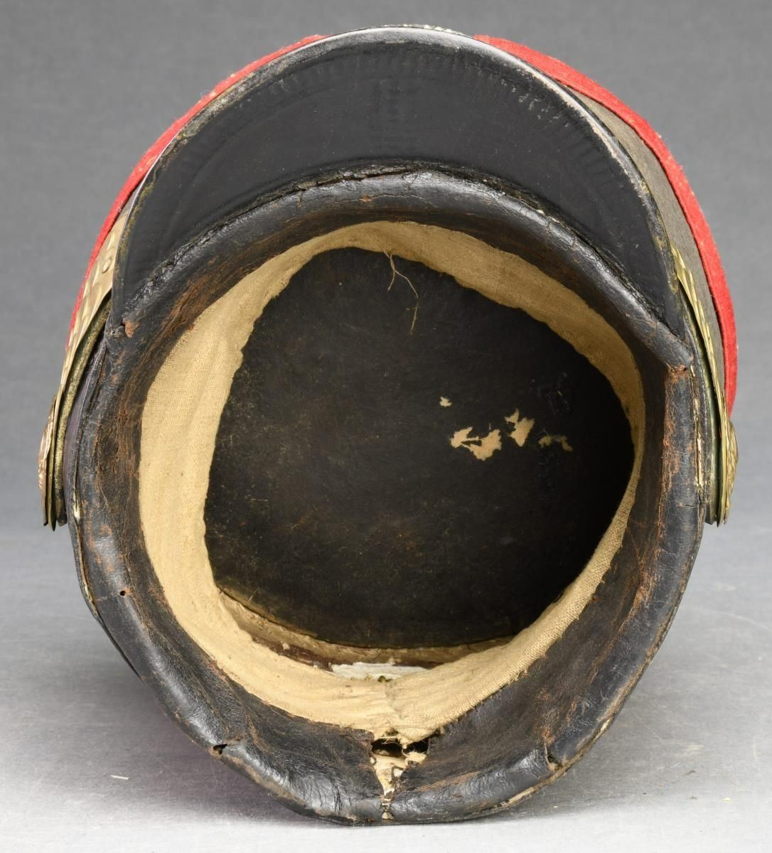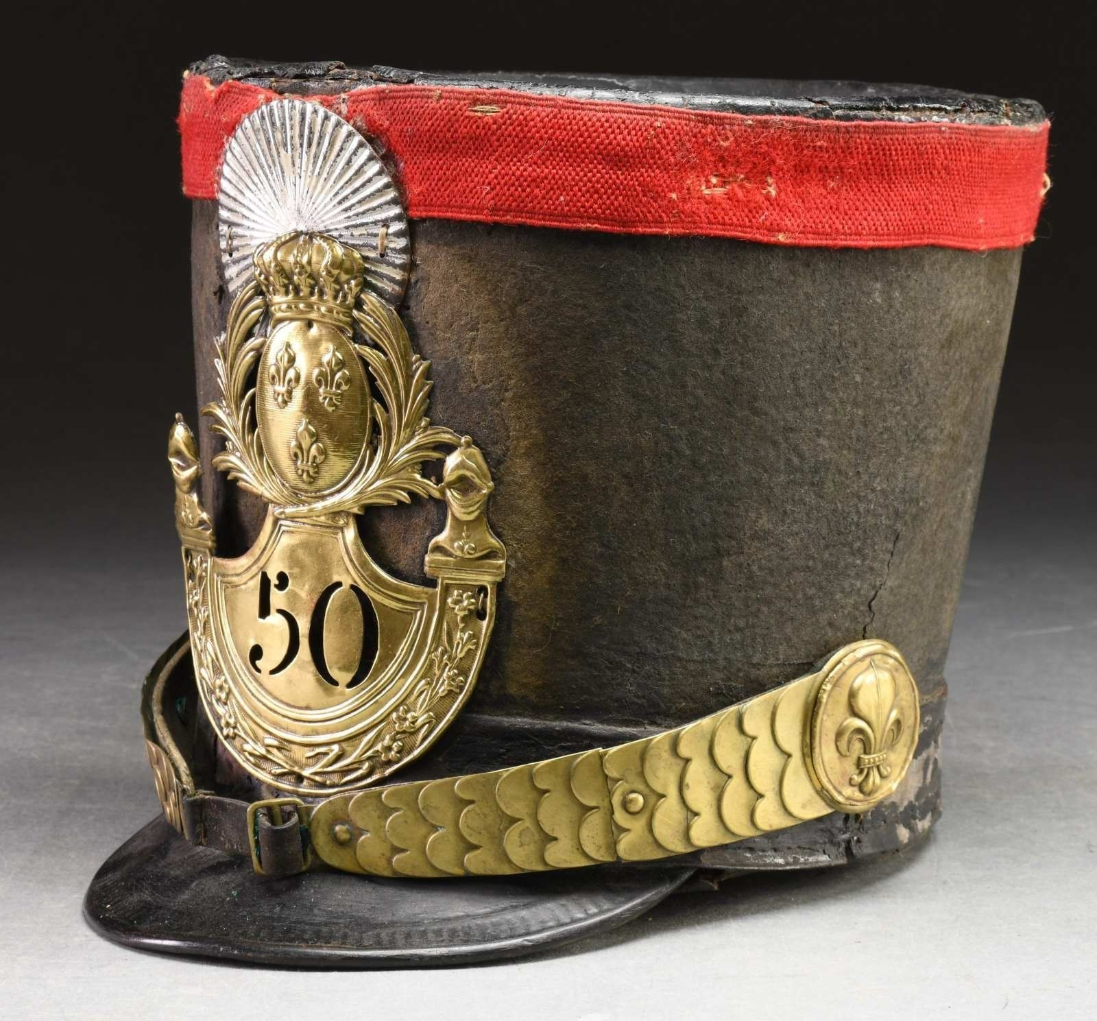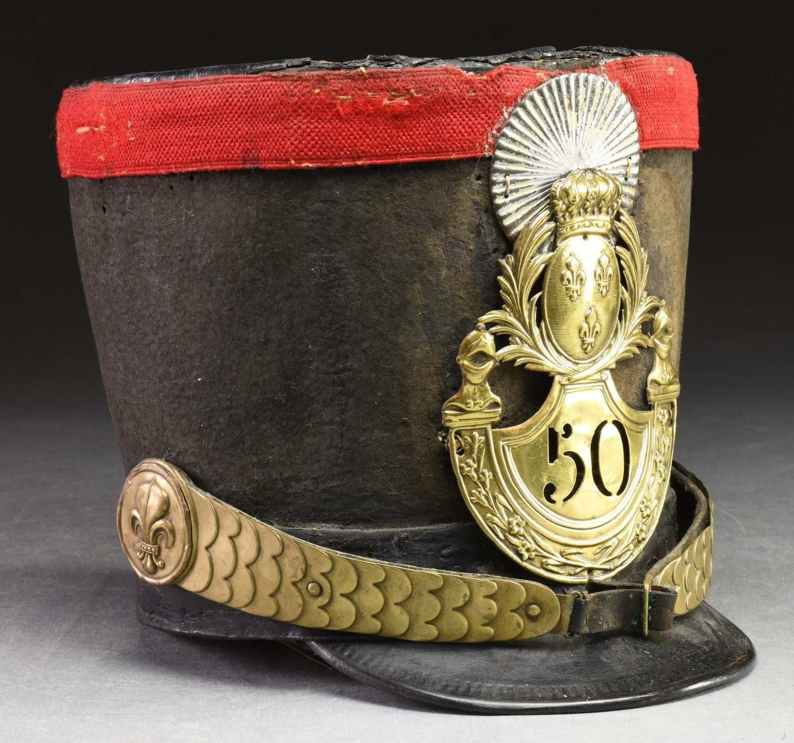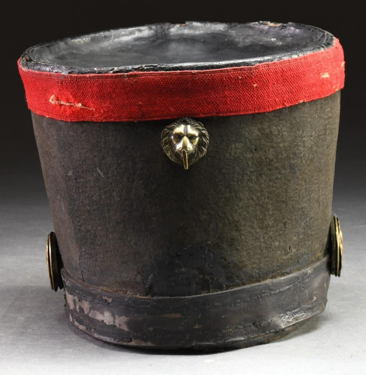 This early 19th century shako has a black leather body with black felt over the exterior front, back, & sides. There is a red wool band around the top, and the crown is smooth leather. There is a metal cockade on the front that appears to have been white painted. The front plate depicts a crown over an oval with 3 fleur de lis over an arc with the number “50” cut out. Brass faux scale chinstrap with fleur de lis side posts. Leather visor. Leather sweatband with muslin bag in the top. The rear outside of the helmet has a lion head cord holder. CONDITION: helmet shows moderate to heavy wear but there is no major damage. The crown has some losses particularly near the front edge. (02-20135/BF). $400-700.