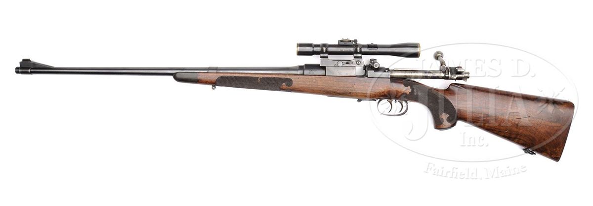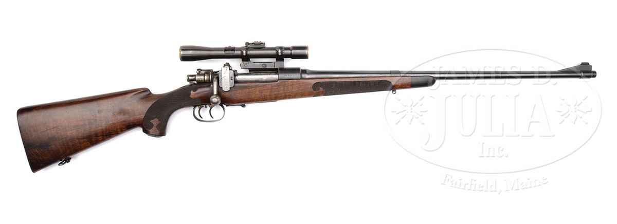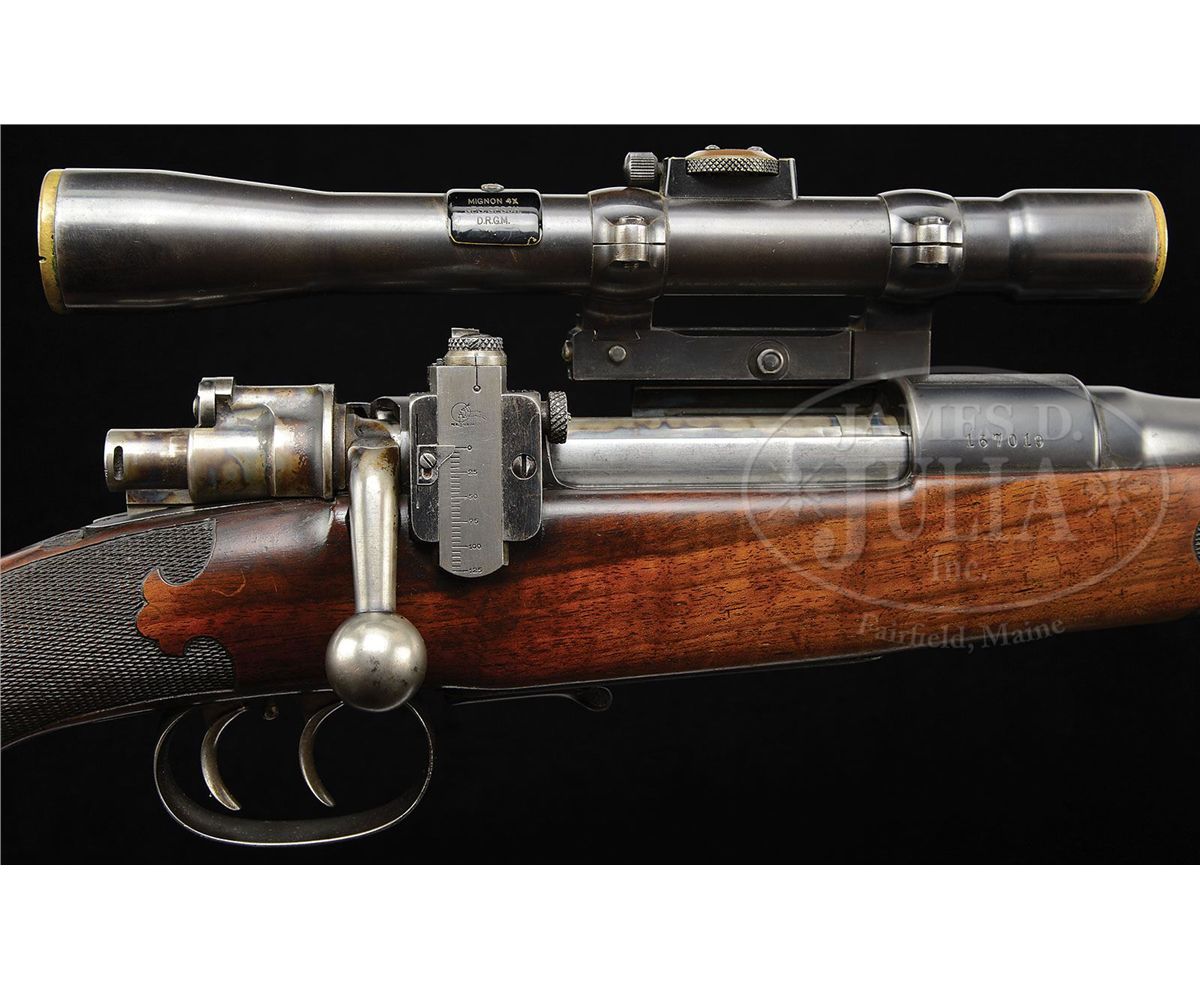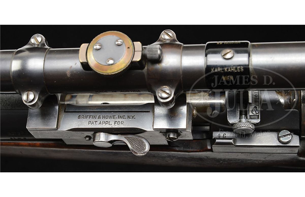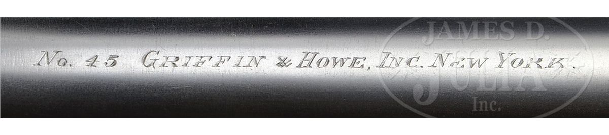 SN 167019. Cal. 30-06. 24" Round bbl has early style sleeved-on swivel eye mount and front ramp not cut for sight hood. Top of bbl is engraved "NO. 45 Griffin & Howe, Inc. New York". Action from ca 1910 J. P. Sauer Mauser bears Sauer's SN on right side, and pre WW I proofs on left. Action has been fitted with Lyman 48 receiver sight, and early G & H scope base. Bottom metal is also typical Sauer with pivoting lever to detach floorplate, and double set triggers. Bolt is color case hardened. Nicely figured and lightly streaked European walnut stock is shaped in early style as done by Fred Adolph who was known to have been working for G & H in the early years; stock features borderless fleur-di-lis style checkering, unique to early G & H rifles, as well as horn grip cap and forend tip. Buttplate is of engraved and checkered steel with trap holding 5-pc cleaning rod. Initials "J G S" are stamped on wood under trap. A Karl Kahles 2-1/2 X scope with post and crosshair reticle is in early, single lever, "patent applied for" mount with windage adjustment. Drop at heel: approx 3-1/16", drop at comb: approx 1-3/4". Weight with scope: 9 lbs. 7 oz. LOP: 14-5/8". CONDITION: Excellent, as found, retaining approx 80% of what appears to be its orig blue, silvered on high points, considerably so on floorplate. Stock retains nearly all of its orig rubbed oil finish, with hand wear at normal carrying points, and a number of heavy and faint marks, grain slightly raised. Checkering is slightly worn, somewhat soiled, with some "bumps". Bore is excellent, bright and shiny with strong rifling throughout. Scope is excellent with same basic condition as rest of rifle, optics slightly cloudy. A fine untouched specimen. 4-48370 MGM15