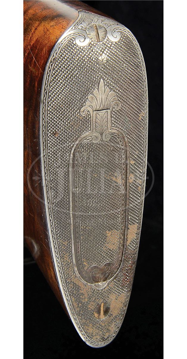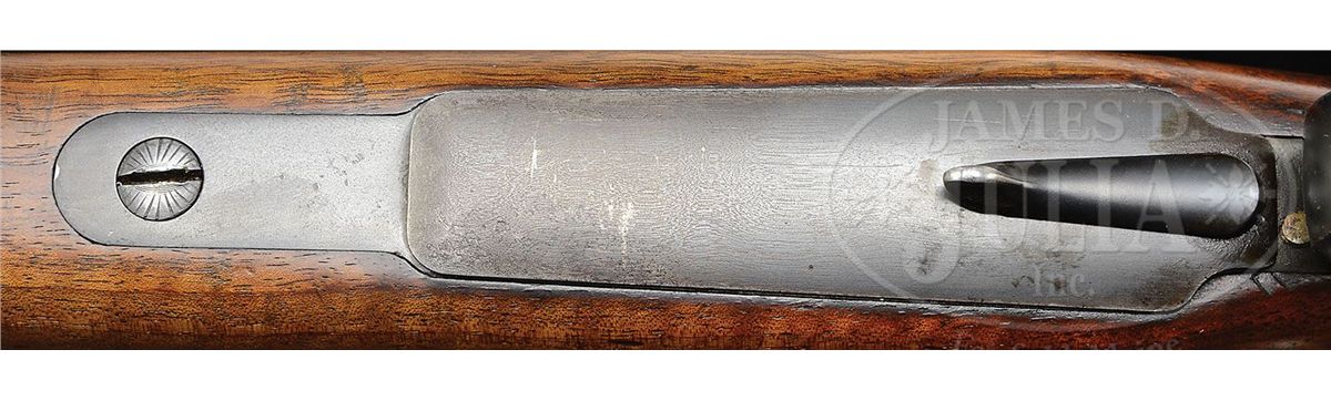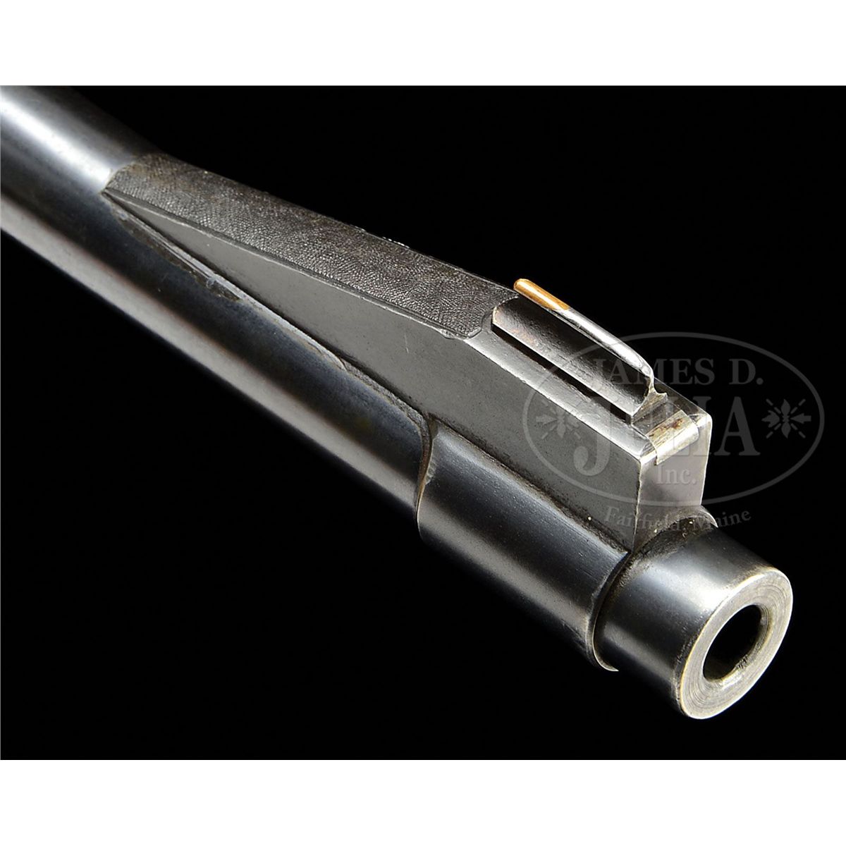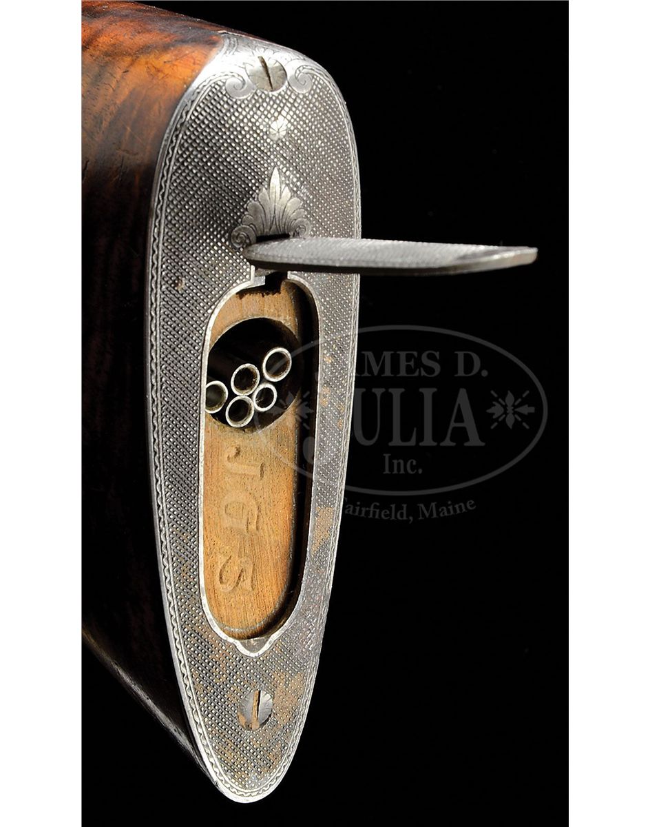 SN 167019. Cal. 30-06. 24" Round bbl has early style sleeved-on swivel eye mount and front ramp not cut for sight hood. Top of bbl is engraved "NO. 45 Griffin & Howe, Inc. New York". Action from ca 1910 J. P. Sauer Mauser bears Sauer's SN on right side, and pre WW I proofs on left. Action has been fitted with Lyman 48 receiver sight, and early G & H scope base. Bottom metal is also typical Sauer with pivoting lever to detach floorplate, and double set triggers. Bolt is color case hardened. Nicely figured and lightly streaked European walnut stock is shaped in early style as done by Fred Adolph who was known to have been working for G & H in the early years; stock features borderless fleur-di-lis style checkering, unique to early G & H rifles, as well as horn grip cap and forend tip. Buttplate is of engraved and checkered steel with trap holding 5-pc cleaning rod. Initials "J G S" are stamped on wood under trap. A Karl Kahles 2-1/2 X scope with post and crosshair reticle is in early, single lever, "patent applied for" mount with windage adjustment. Drop at heel: approx 3-1/16", drop at comb: approx 1-3/4". Weight with scope: 9 lbs. 7 oz. LOP: 14-5/8". CONDITION: Excellent, as found, retaining approx 80% of what appears to be its orig blue, silvered on high points, considerably so on floorplate. Stock retains nearly all of its orig rubbed oil finish, with hand wear at normal carrying points, and a number of heavy and faint marks, grain slightly raised. Checkering is slightly worn, somewhat soiled, with some "bumps". Bore is excellent, bright and shiny with strong rifling throughout. Scope is excellent with same basic condition as rest of rifle, optics slightly cloudy. A fine untouched specimen. 4-48370 MGM15