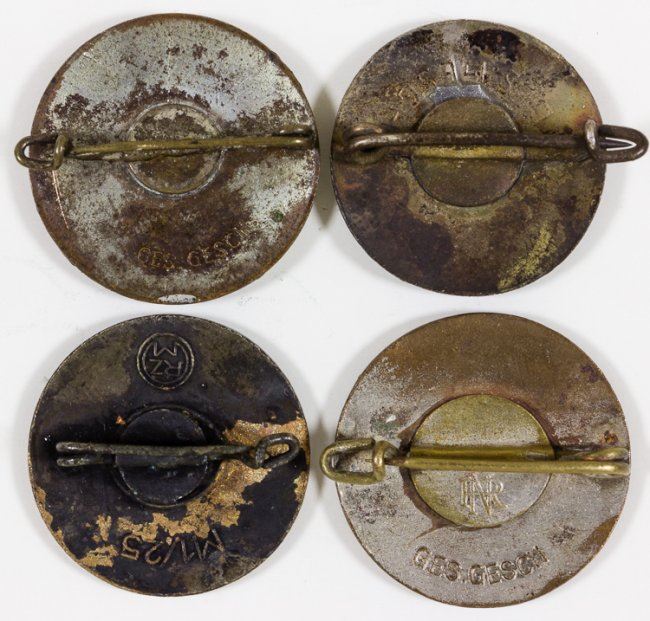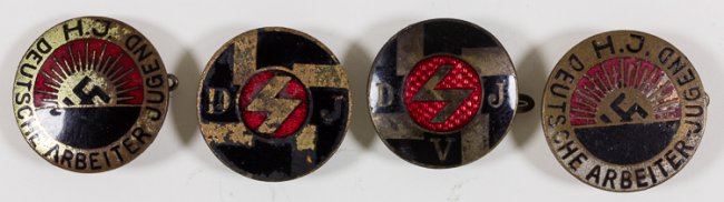 Lot of four early partially-enamelled Hitler Youth and Deutsches Jungvolk membership pins, each about 1? diameter, maker-marked on verso. Condition varies.