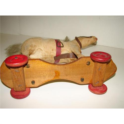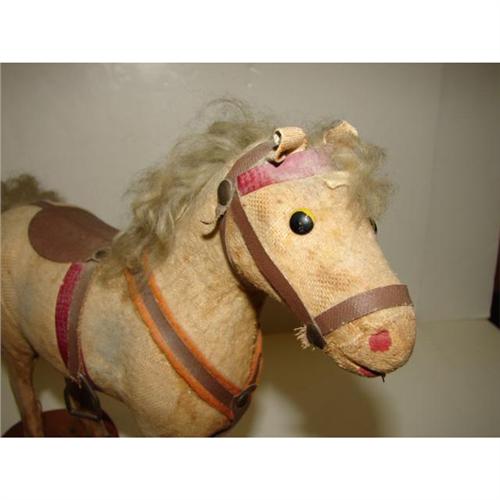 EARLY CHILD’S HORSE PULL-TOY. Wooden horse is wrapped in fabric and has hair and applied saddle. Horse is mounted on a wooden base with four wooden wheels. 10.25” H, 10.5” L