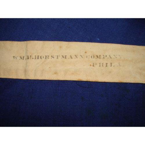 EARLY HORSTMANN OFFICIAL STATE FLAG OF DELAWARE. Circa 1919-1920. Manufactured by Wm. H. Horstmann Company, Philadelphia, Pennsylvania. Constructed of wool with hand painted State Seal of Delaware on buff colored diamond. Words "December 7, 1787" are stitched to flag beneath diamond. Hoist is marked with stenciled text "Wm. H. Horstmann Company/Phila." Brass grommets. Shows some small areas of staining and a few small tears. 3" x 5". General I.P. Wickersham, Adjutant General of Delaware, led the effort for a physical creation of the new official State Flag. Prior to the adoption of an official State Flag, Gen. Wickersham had placed an order with Wm. H. Horstmann Company in May 1906 for a Governor’s flag. The flag was to measure 36" x 48" and was constructed of light blue silk with an embroidered Coat of Arms and trimmed with yellow knotted silk fringe. Gen. Wickersham placed another order with Wm. H. Horstmann Company for a Governor’s flag in January 1913. This 36" x 48" flag was to be constructed of dark blue silk instead of the light blue silk that was ordered in 1906. In 1913, a commission was established to adopt an official State Flag and State Colors for the State of Delaware. The commission was comprised of Dr. George W. Marshall, President Pro Tempore of the Senate, Chauncey P. Holcomb, Speaker of the House of Representatives, and Thomas W. Miller, Secretary of State. The men met on July 24, 1913 at Camp McDonough at the State Rifle Range near Newcastle. After careful deliberation over several designs, Mr. Holcomb made the motion that the design for the State Flag be as follows: Background of Colonial blue, surrounding a diamond of buff which was to contain the correct Coat of Arms of the State of Delaware, in the colors prescribed by law and in accordance with Chapter 62, Volume 26, Laws of Delaware, with the words December 7, 1787 to be underneath. Mr. Miller made the motion that the Governor’s flag should be similar to the State Flag, except that a fringe of gold is to surround the edge of the flag and the pole carrying the flag is to be mounted with a model of a blue hen’s fighting cock. On July 9, 1914, Secretary of State Miller sent to Gen. Wickersham a Photostat of the recently adopted State Flag with specifications. Subsequently, on June 22, 1915, Gen. Wickersham placed an order with Wm. H. Horstmann Company for a 36" x 48" flag to be used by the "Governor of the State" and "made in accordance with this Specification". On July 20, 1915, this Governor’s flag, "made according to the State Specifications", was delivered to the State. This Governor’s flag of 1915 was the only example of an official State Flag to be constructed for over three years. In May 1918, a lack of an official State Flag became evident at a Governor’s Conference in Philadelphia. Independence Hall was to be decorated with the official State Flags of all Governors present at the conference. When Delaware was asked for its State Flag, "the reply had to be made that Delaware did not own one". On December 30, 1918, Governor John G. Townsend, Jr. presented the Governor’s flag of 1915 to the State House to prevent future embarrassments. During this time, it seems that government officials were in the process of obtaining flags for use in government buildings. On December 6, 1918, Earle D. Willey, State Librarian, sent a letter to Gen. Wickersham regarding State Flags. The letter reads: "I am returning the correspondence relative to flags, which you kindly loaned me. The Co. has promised to have our flags here by the dates specified, and I hope nothing will happen to prevent the delivery." Although no specific information can be derived from the letter, the company that he is referring to is most likely Horstmann. During this time, Willey was also serving as secretary of the Delaware State Library Commission, which held their monthly meetings in the Supreme Court Room of the State House. A review of the Commission’s meeting minutes revealed that it was not uncommon for Willey or the Commission to paint or make repairs to the room(s) that they occupied, while they were waiting for approval of permanent offices in the State House. A review of government disbursements at the State Archives found William Horstmann being paid $8.50 from the Delaware State House Heat, Light, & Repairs Account on May 2, 1918. Two reimbursements were also made to Earle Willey from this account. Willey was paid $10.67 on November 25, 1918 and $8.12 on January 2, 1919. It can be assumed, but not proven, that Willey, in his letter, was referring to flags that were purchased from Horstmann for the State House. Whether Willey was using these flags to decorate the building or only the offices the Commission occupied is unknown. Regardless, these flags would have been the earliest documented official State Flags of Delaware ever produced (the flag of 1915 was a Governor’s flag).