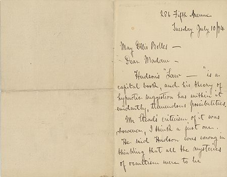 Fine content A.L.S. by "Thomas Stevens", 2pp. 8vo., New York, July 10, 1894, in part: "... Hudson's 'Law '-- is a capital book, and its theory of hypnotic suggestion has within it evidently, tremendous possibilities. Mr. Steads's criticism of it was, however, I think a just one. He said Hudson was wrong in thinking that all the mysteries of occultism were to be unlocked with his one [key] of hypnotic suggestion. I hope by lecturing throughout the country by and by to awaken a serious interest in these matters. Western peoples have I think been mistaken in not treating these Oriental mysteries sufficiently serious. I would like to satisfy your curiosity by enclosing a Yogi photograph, but you will understand why I cannot let them go out of my own possession...". Very good.