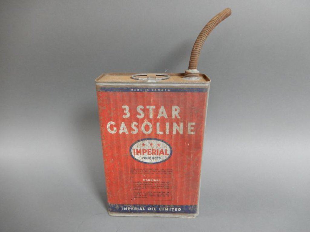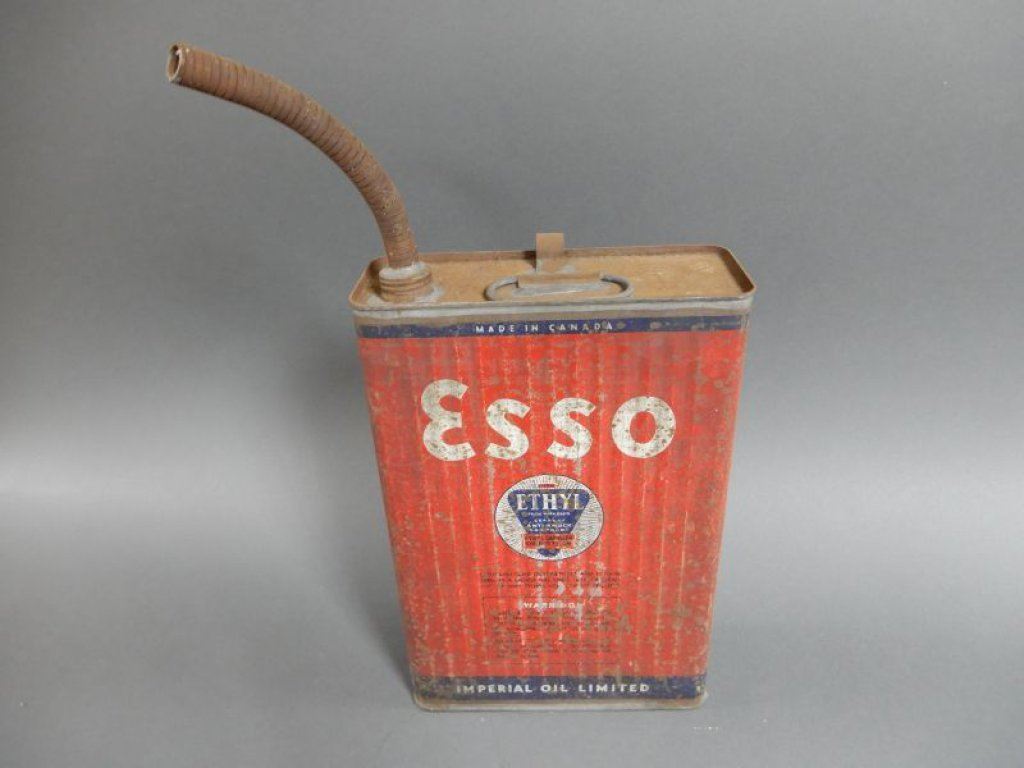 EARLY IMPERIAL ESSO 3 STAR RIBBED GASOLINE CAN CORRECT SPOUT SOLDERED SPOUT & HANDLE SURFACE RUST & WEAR LOCATION: LOWER LEFT