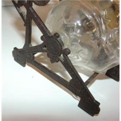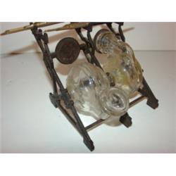 EARLY INKWELL SET. Wrought iron holder with two swivel glass bottles. Holder is ornately decorated. Bottles are in good condition. 4.25" H, 5" W