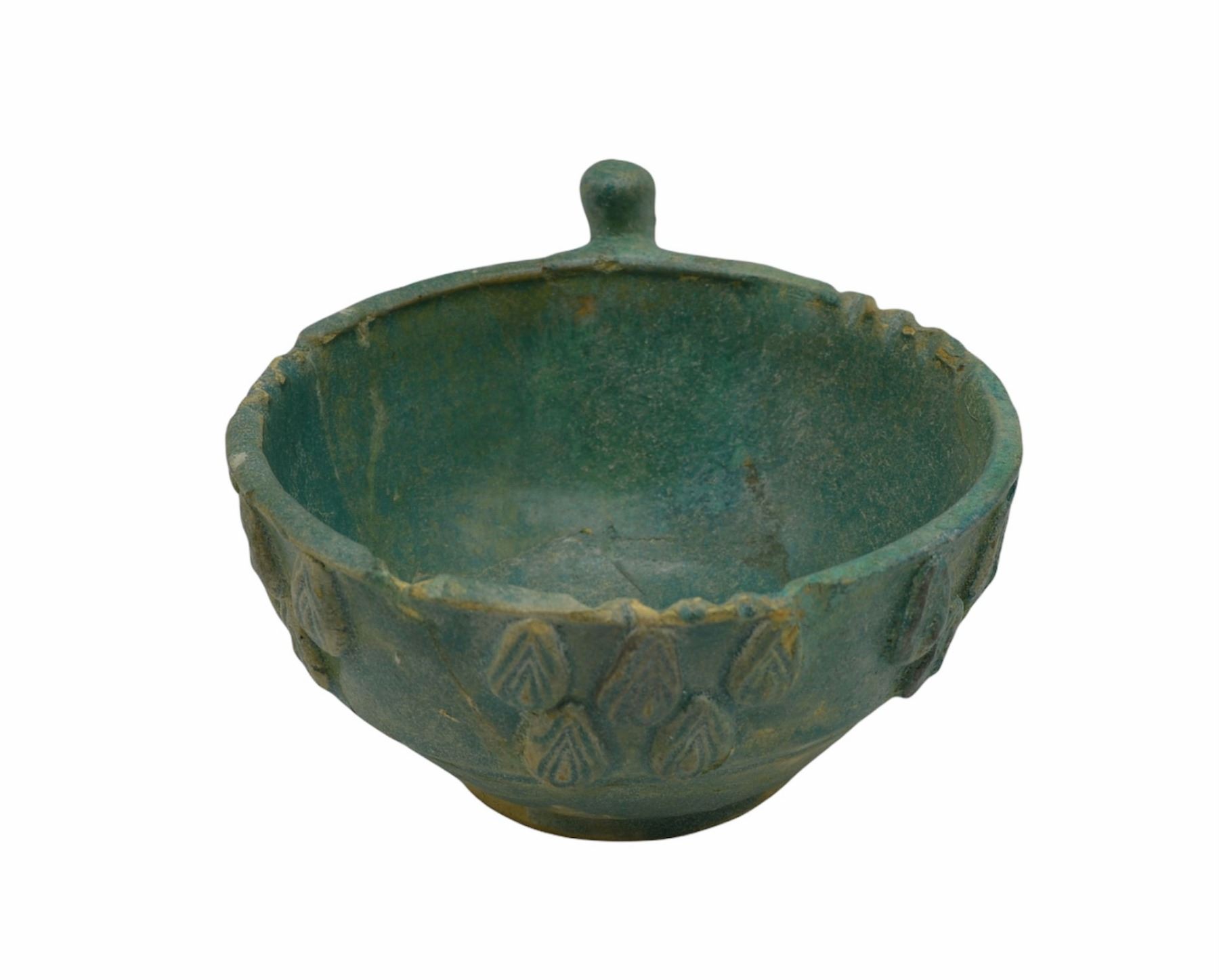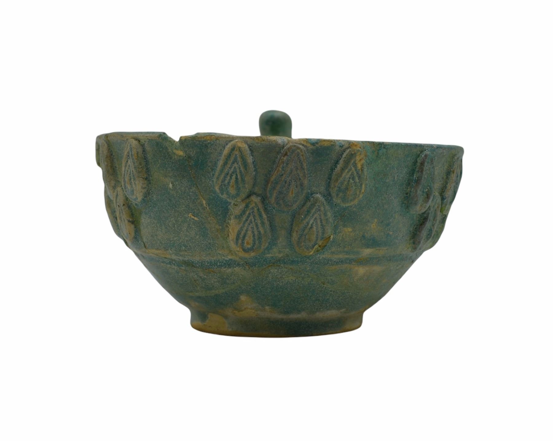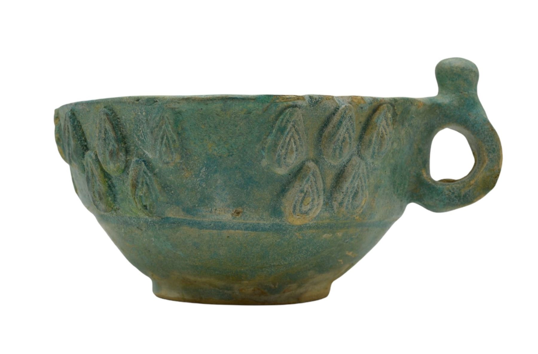 A VERY RARE ANCIENT ISLAMIC ABBASID MOULDED POTTERY CUP MESOPOTAMIA, CIRCA 9TH/ 10TH CENTURY. on a short foot with ring handle and conical thumb piece, moulded with a band of almond shaped medallions foliate motifs.