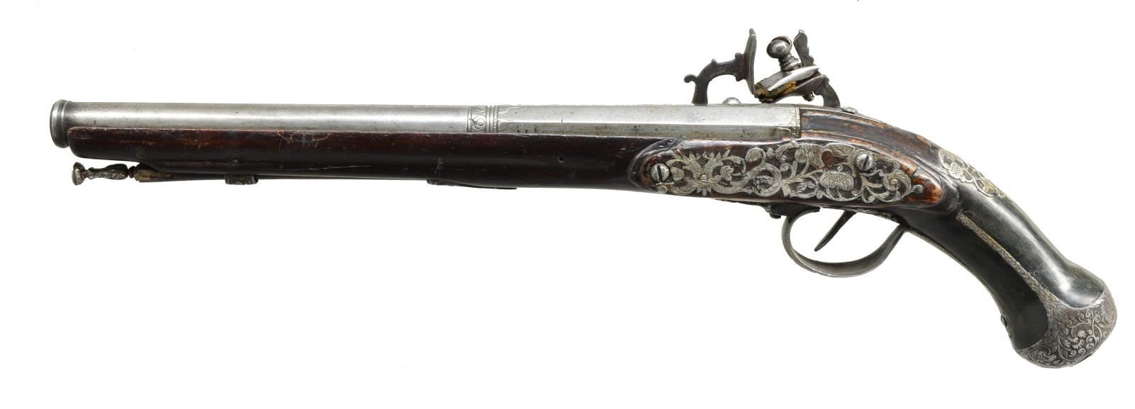 Cal. 65. NSN. Bbl. 12" oct. to rnd., w/ cannon muzzle is unmarked & engraved w/ some scroll. Sanphaunce lock is nicely filed & has removable pan w/ sliding cover & file decorated cock & frizzen. Lock engraved w/ open scroll & acanthus. Screw which retains cock is relief engraved w/ a cherub's face. Interior of lock has nicely filed components & has maker's mark B:Z at bottom. Walnut stock is pinned to bbl. & extends to w/ in a 1/4" of muzzle & is iron mounted. Mounts are either relief engraved or pierced & are quite fancy. Bulbous spurred grip cap has demon's head on boss. Sideplate has many piercings through its scroll & floral motifs. Fancy trigger plate has the same treatment. Trigger guard has relief engraved finial & bow. Other pierced scroll is at top of grip. Walnut ramrod has fancy turned & decorated tip & is held by relief engraved pipe & matching thimble. CONDITION: fair to good. Metal parts cleaned to pewter gray & silver w/ scattered pitting. Stock has a number of repairs at front portion of lock & at butt, which has considerable filler. Iron mnts. match the condition of other metal parts. PROVENANCE: The Estate Collection of Gary Parietti. (01-19052/MGM). ANTIQUE. $2,000-3,000.