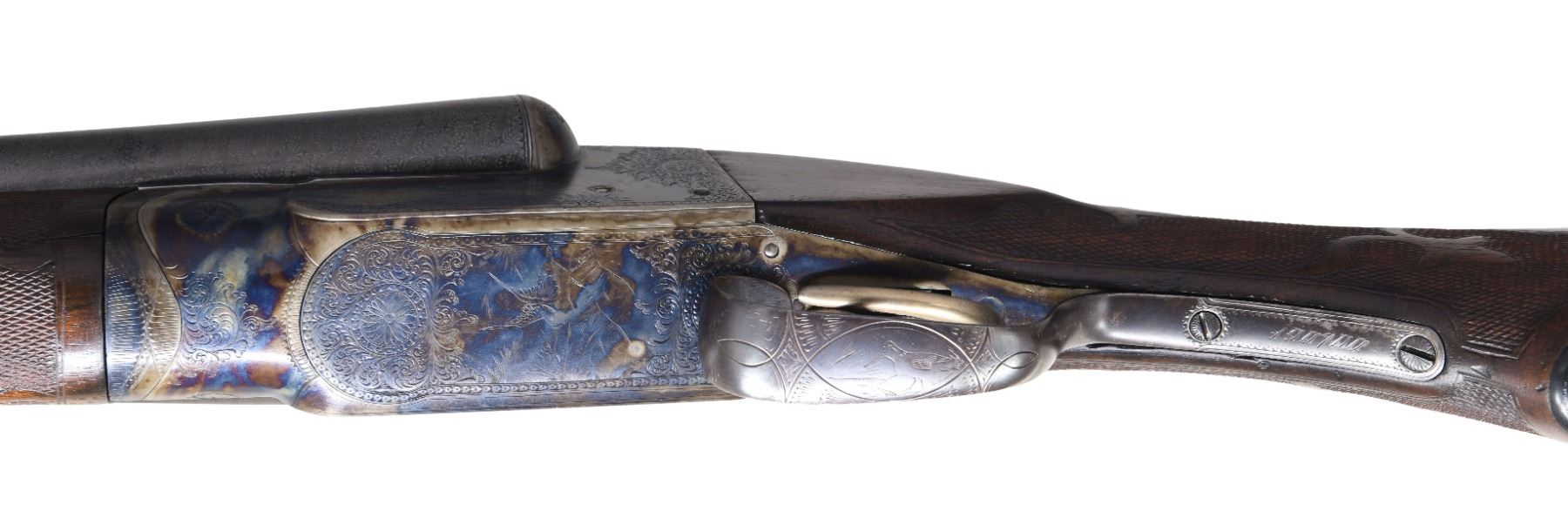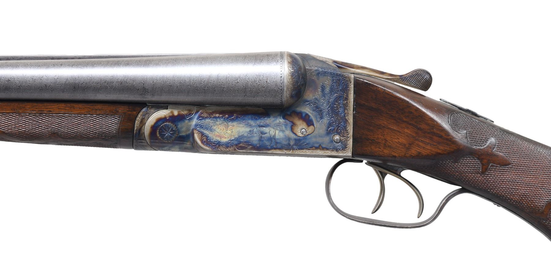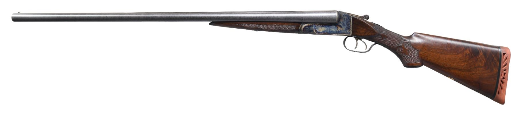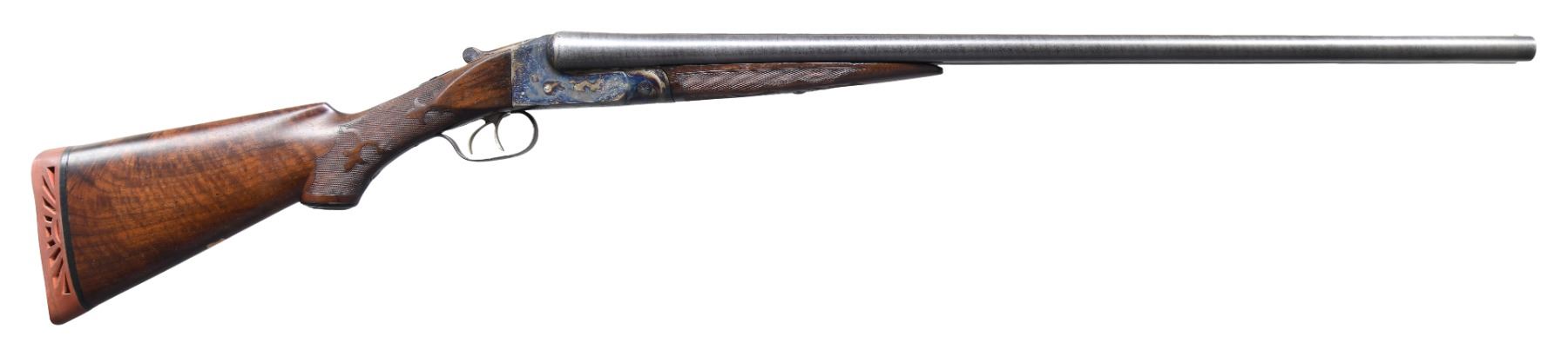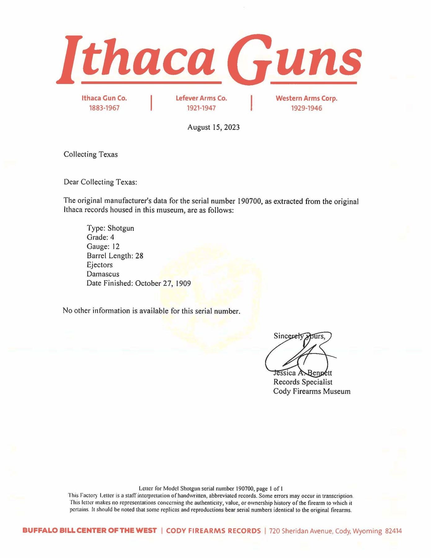 Cal. 12ga 2 5/8". S# 190700. Bbls 28" of damascus steel. Fixed MOD and FULL chokes. Brass front bead. Factory engraved action features a pointing setter on the right side with pointer on left and flying mallard on floorplate. Scenes are surrounded by foliate scroll and fancy borders. Trigger guard engraving features a woodcock. Double triggers. Ejectors. Splinter forearm and hard rubber capped pistol grip stock. Nicely grained black walnut with brass shield and toeline. LOP: Altered to 13 7/8" over an added Ithaca Sunburst pad. Stock and forearm have segmented fleur-de-lis Grade 4 hand checkering. UNATTACHED ACCESSORIES: letter from Ithaca Guns dated August 15, 2023 states "The original manufacturer's data for the serial number 190700, as extracted from the original Ithaca records housed in this museum, are as follows: Type: Shotgun; Grade: 4; Gauge: 12; Barrel Length: 28; Ejectors; Damascus; Date Finished: October 27, 1909". CONDITION: refinished shotgun. Damascus bbls retain 90% of re-brown finish having a light gray tone. Action has 98% restored case colors. Sanded and refinished wood have lightly worn checkering. Good bright bores. (25-1162/DS). CURIO. $1,000-1,500.