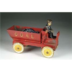 EARLY KENTON MOTORIZED COAL TRUCK. Red enameled truck is embossed “COAL” on both sides. Steel wheels painted silver with yellow hubs. Figure is enameled blue with gold hat & a flesh colored face. Replaced steering wheel. When pulled, side lever dumps coal. SIZE: 8-1/4” l. CONDITION: Overall toy is very fine, paint is thin in spots. MC 1-3908 (500-600)