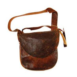 EARLY KENTUCKY RIFLEMANS POUCH. The small leather pouch with drop-down flap. Saddlebags shaped with two pouches inside that will expand. Having the original leather strap, and a small antler carved powder measure, together with a small period powder horn. SIZE: Bag approximately 7-1/2” x 7”. Horn approximately 6”. CONDITION: Leather fragile. Strap delicate with some losses and old repairs. 3-30445