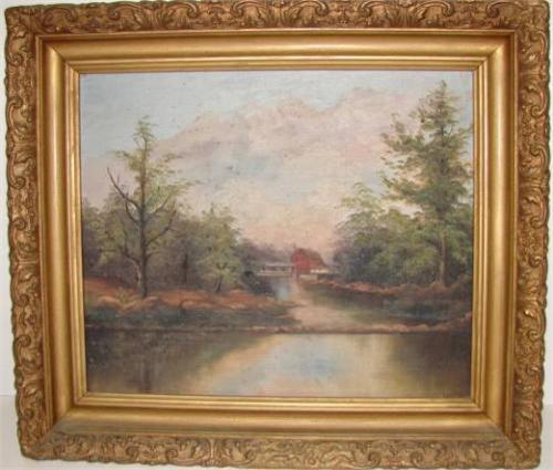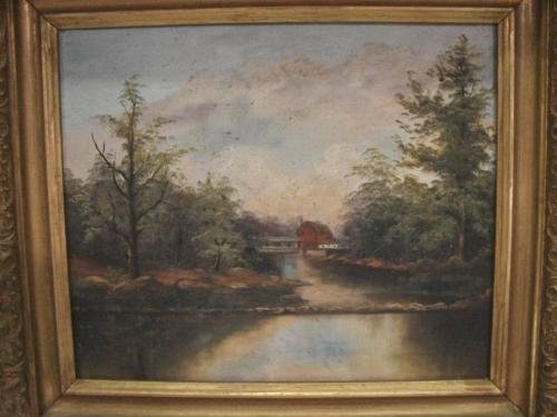 EARLY OIL ON CANVAS PAINTING OF LANDSCAPE. Depicts a river scene with a covered bridge. Unsigned. Painting rests in ornate gilt wood frame. 15.25" x 13.25" framed.
