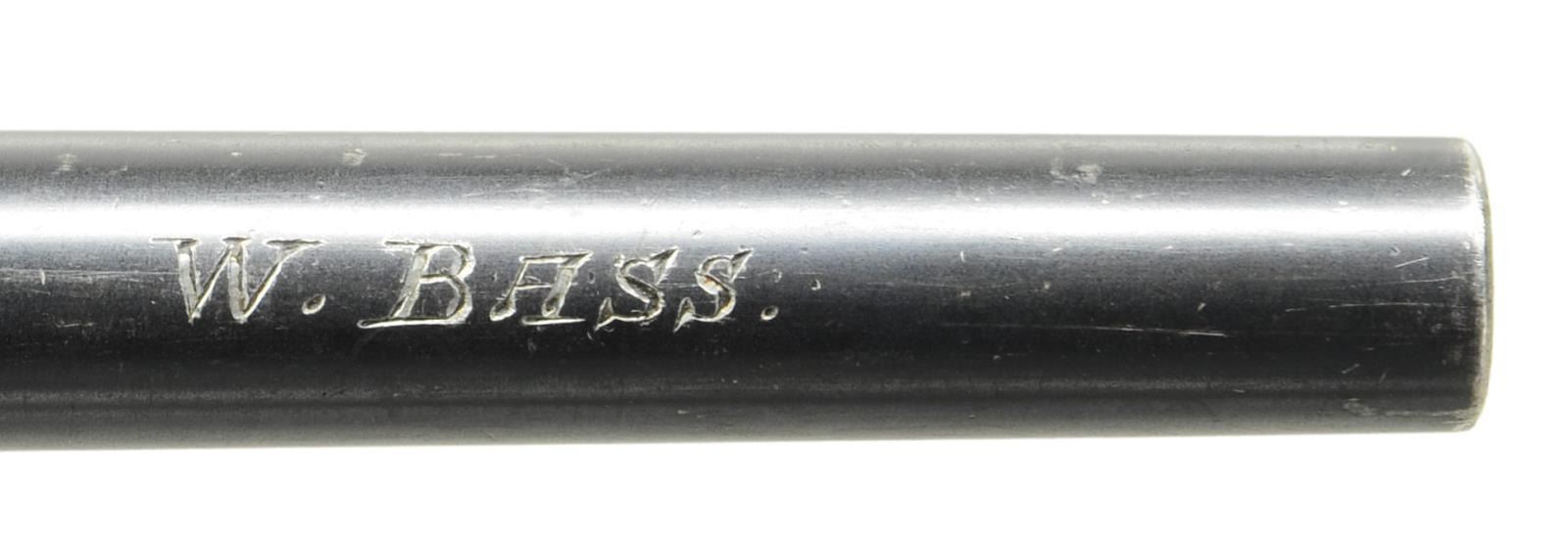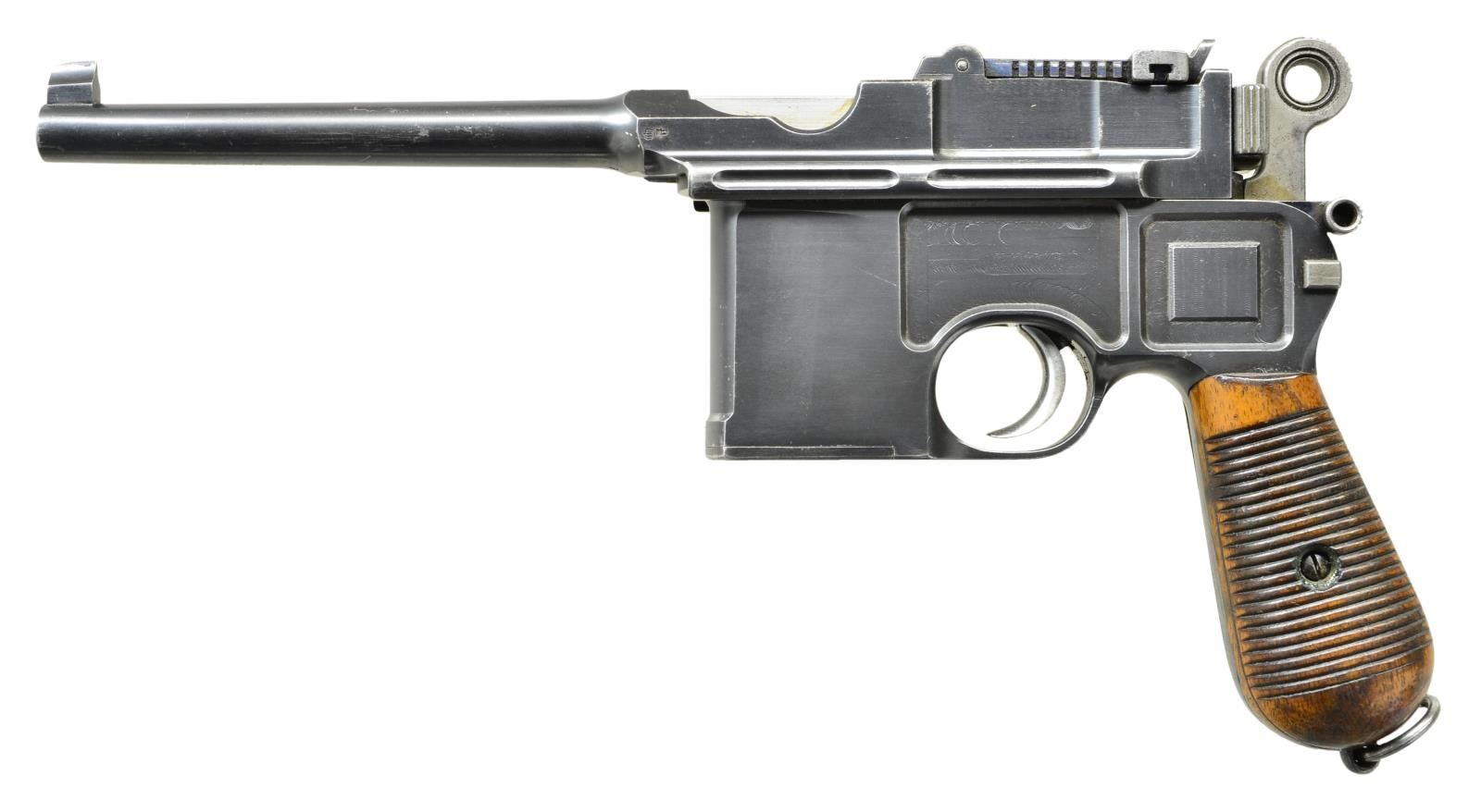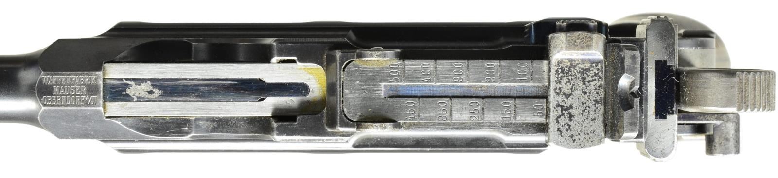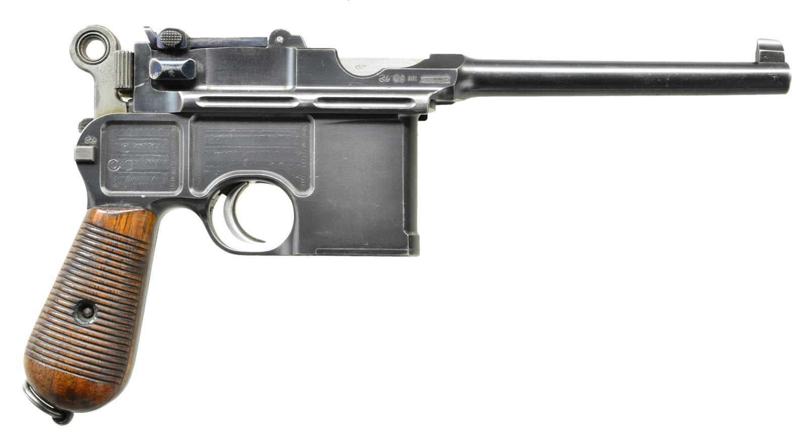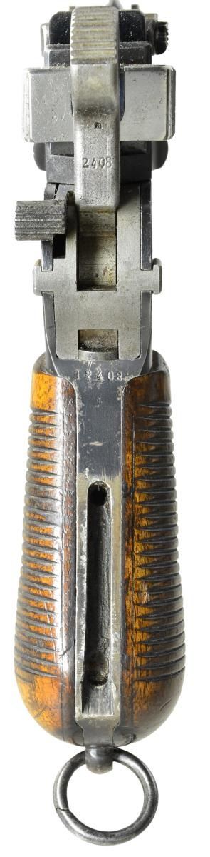 INSCRIBED. Cal. 7.63mm S# 12408. Earliest Mauser Lg. Ring production that was assembled using Conehammer frames & trigger groups, this example having a 5.5" bbl, fixed front sight & pinned rear sight graduated 50-500. Long extractor, independently secured firing pin, lg. ring hammer. Chamber marked w/ usual Mauser address Crown/"C"/"U" on left side of bbl. extension; antler proof on right. In keeping w/ this pistol's export to England, British proofs are now on the right side of the bbl. extension including "NOT ENGLISH MADE" within hash marks that overlie the antler proof. Additional British proofs on the side of the bolt & frame just above the subframe lug. Ownership inscription "W. BASS" under the bbl. Major components rust blued. Most minor components fire blued; bolt, hammer, subframe & trigger in the white. Serrated walnut grips. Lanyard ring present. Disassembly shows all matching S#s including the sight bar & each of the grips. UNATTACHED ACCESSORIES: CONDITION: 97% original rust blue. 70% fire blued small parts w/ noticeable loss on the extractor & most of the finish having faded from the cursor. Comparable condition grips w/ oil darkening & scattered handling dings. Bright bore w/ sharp rifling. Perfect manual mechanics. A very attractive early Large Ring Transitional pistol w/ Conehammer components, especially nice as it is an antique! (01-21639/LMA). ANTIQUE. $4,000-6,000.