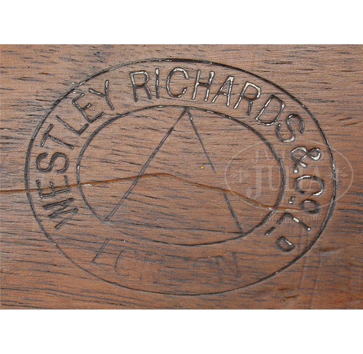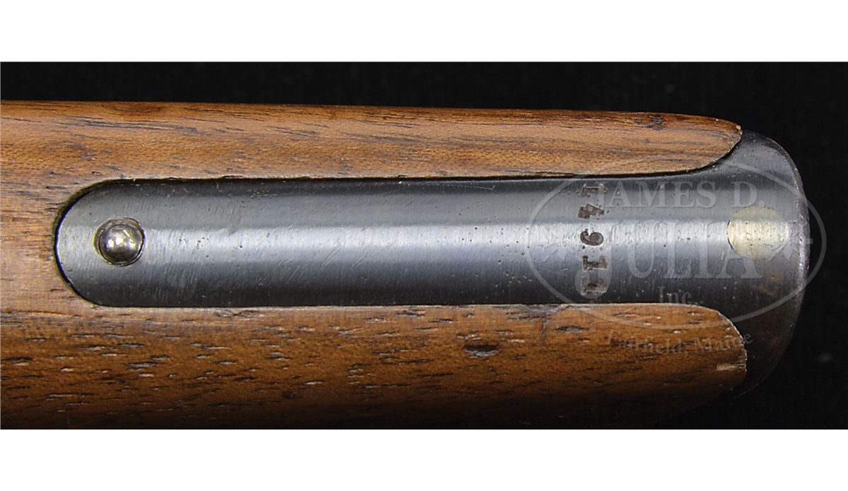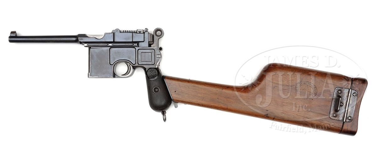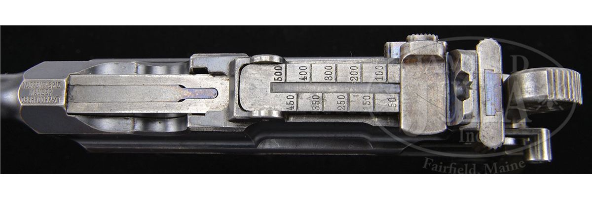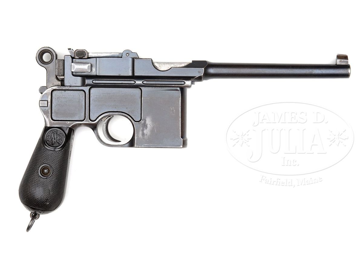 SN 14702. Caliber 7.63mm Early Large Ring Transitional with many Conehammer features with 5.5" bbl and pinned 50-500 rear sight. Mauser address on chamber and Crown U marking on left side of bbl extension. Antler proof on right side. Serial number is marked under the sight assembly, bolt stop, firing pin retainer, hammer, and frame above the stock slot. Long extractor, independently secured firing pin, and Conehammer trigger. Fire blued extractor, sight assembly, bolt stop, firing pin retainer, safety, and grip screw. Original MW initialed hard rubber grips. All matching numbers on disassembly, including each grip panel whose full serial number has been scribed in the usual manner. Lanyard ring is a replacement. Shoulder stock marked on the left side with the Westley Richards & Company logo and lug #1491. The lid has been recessed for the large ring hammer. A larger non-factory relief cut has been made to more easily close over the safety. PROVENANCE: Joseph J. Schroeder, Jr. Collection. CONDITION: Original blue estimated at 50% with the balance toned to a patina. Most of the wear is under the bbl and around the magazine well. The front and back strap have toned to a gray. Comparable condition oxidative loss on the extractor, rear sight assembly, and the exposed surface of the bolt stop. Excellent and surprisingly good condition hard rubber grips with minor flattening of checkering and a few tiny mars on the right side. The body of the stock has been partially refinished though the Westley Richards imprint is clearly legible. Two hairline cracks on the left and right side have been repaired. The stock lug, that still bears the original numbering, has been refinished with a correct fire blue. Moderate oxidation of the hinge. No cracks of the lid. One of very few Early Large Ring Transitional pistols to have hard rubber grips! 4-48561 LMA12