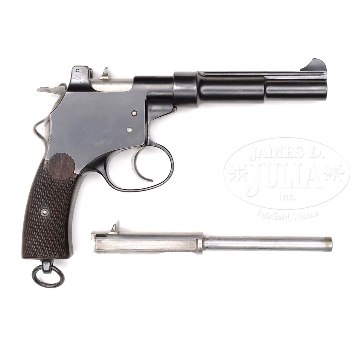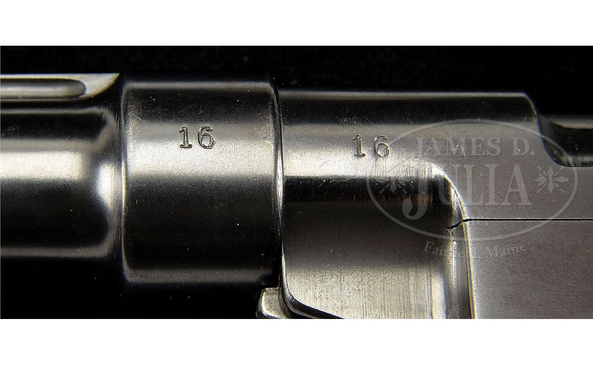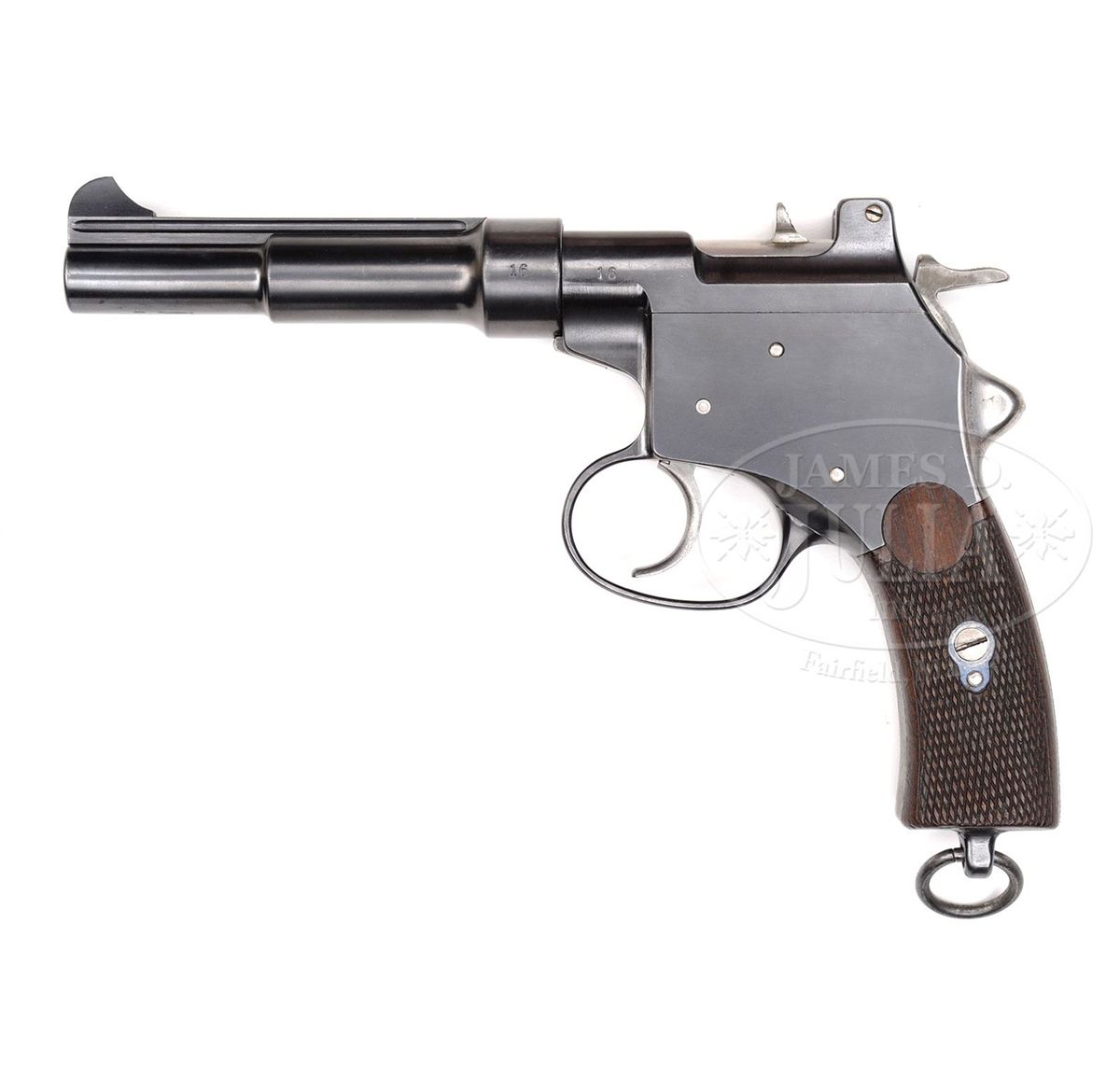 SN 16. Cal. 7.6mm. Mannlicher made approximately 100 large frame M1894s in caliber 7.6mm. Early pistols, as this example, had a flat hammer. Once production was established, the hammer was changed to the more common beaver tail form as is found on the smaller frame guns. This full size pistol is unmarked except for the serial number that appears on the left side of the bbl shroud and is repeated on the left side of the left side of the receiver and on top of the 7.25" length bbl. As true for all blow-forward pistols, the cartridge is chambered on the rearward movement of the bbl. The pistol can be fired in either the single or double action mode. Disassembly is accomplished by removing the grips and releasing the tension on the hammer spring. At that point, the lever under the bbl shroud can be released, allowing the shroud to be unscrewed and the bbl removed from the frame. Although the pistol is presently fitted with a matching serial number bbl in 6.5mm, the extractor is too large for the 6.5mm rim. The original 7.6mm bbl is supplied separately. PROVENANCE: Dr. Geoffrey Sturgess Collection, ex-Visser collection. CONDITION: The bbl shroud each side of the frame and trigger guard have over 98% bright original blue. The frontstrap, backstrap and tang areas have been carefully cleaned and now appear in the white. Both barrels are in the white as is correct for this variation with crisp near-mirror bores. Orig grips with minimal handling marks and left screw escutcheon retaining much of its original fire blue. Perfect mechanics. Extremely scarce early semiautomatic, with alternative caliber bbl, that should please the most discriminating collector. 4-52220 LMA90
