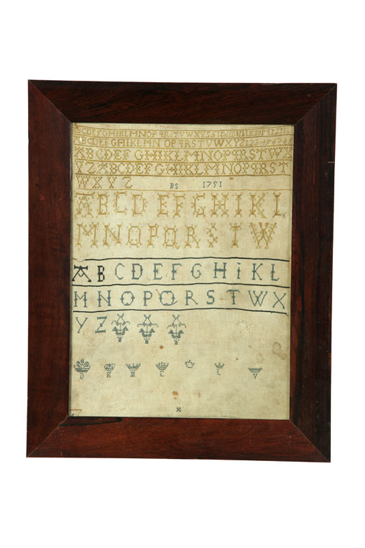 American or English, 1751, silk on linen. Set of alphabets and numbers with rows of various crowns worked blue and gold. Signed "BS 1751". In a frame, 20 1/2"h. 16 1/2"w.