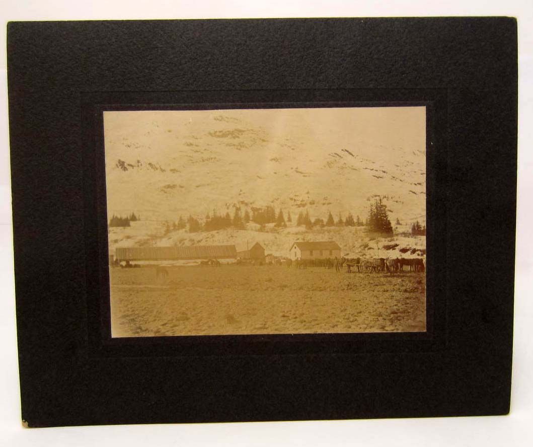 EARLY MOUNTED PHOTO OF GOVERNMENT HORSE STABLES AT FORT LISCUM ALASKA - 10.5" x 8.5"