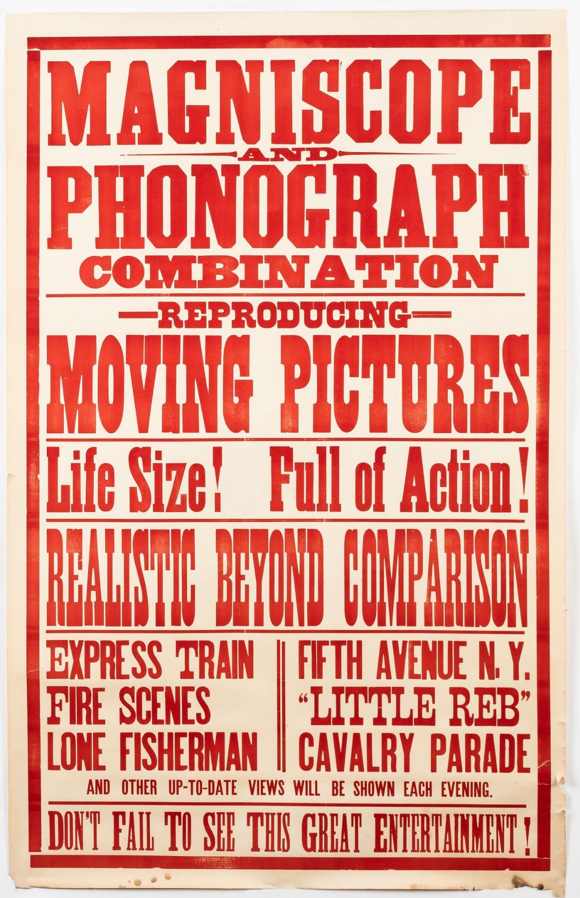Advertising poster for a 'Magniscope and a phonograph combination reproducing moving pictures - Life Size! Full of Action! Realistic Beyond Comparison! - Don't Fail to See this Great Entertainment!', early 1900s, 43 x 24 inches. Chipping and loss at edges.