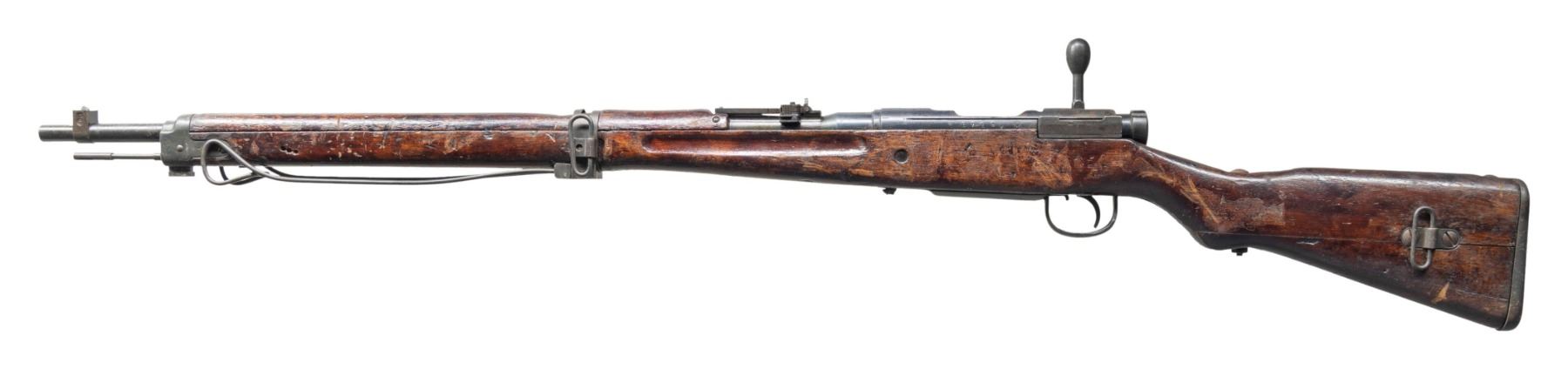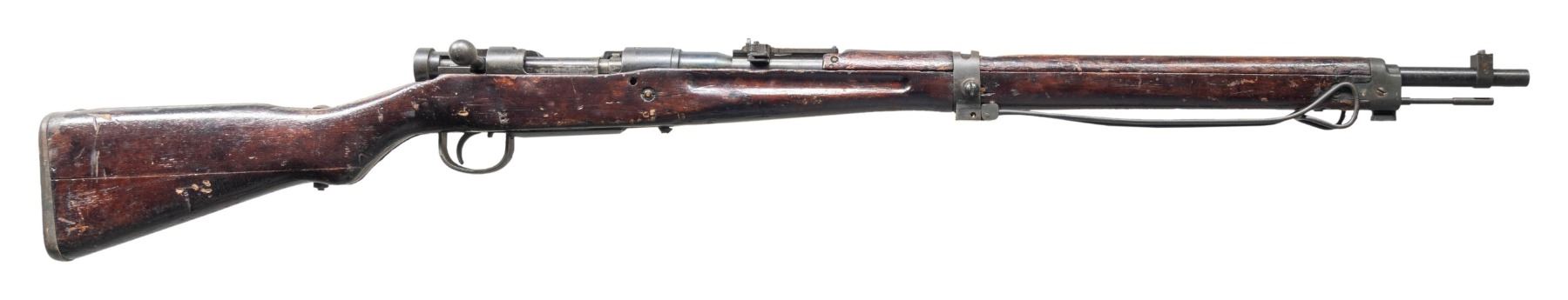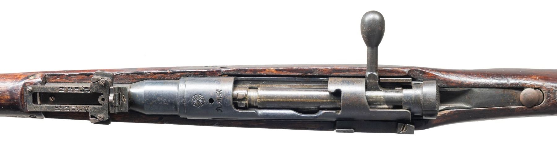 Cal. 7.7 Jap. S# 17189. Bbl. 25 1/2". Blade front sight with removed protective ears. Ladder aperture rear sight graduated to 1500 that is missing its AA wings. Extractor also missing. All matching numbers including safety & firing pin. Receiver top has fully intact mum & type 99 markings. Left side of the receiver has Nagoya & first series markings. Monopod present that is bent & appears original. Front action screw is protruding outward & rear tang screw is a modern incorrect replacement with washer. Blued finish. Asian hardwood stock set with two piece butt. Cleaning rod present. CONDITION: sanded stock has thickly added finish with a few cracks, some chipping, scattered peeling, dings, dents, handling marks & wear. metal shows thinning, finish overrun, scattered pitting, fading & oxidation. Safety not engaging properly & bolt does not cycle all the way to rear likely requiring attention to fix. Very good bright bore. (25-2777/MJC). CURIO. $300-400.