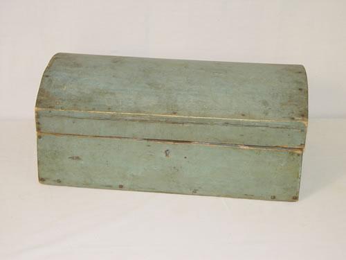 EARLY NEW ENGLAND 19TH CENT. PINE DOME TOP DOCUMENT BOX W/ OLD ROBINS EGG BLUE PAINT W/ SQUARE HEAD NAIL CONSTRUCTION - LINED W/ EARLY WALLPAPER, WEAR & LOSSES