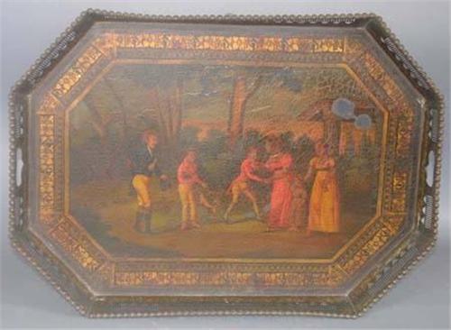 EARLY NEW ENGLAND PAINTED TRAY with colonial scene and associated base tray: 18"x 24 1/2"