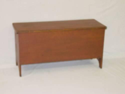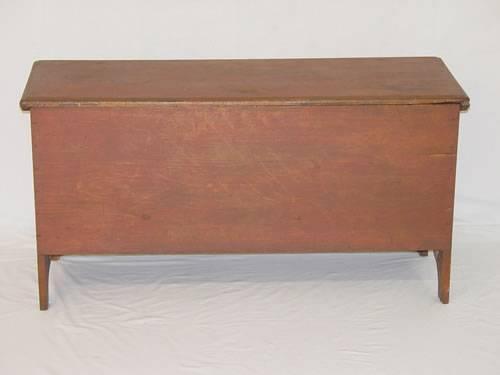 EARLY NEW ENGLAND PINE BOARD BLANKET BOX W/ CUT-OUT ENDS IN OLD RED WASH - IMPERFECTIONS;