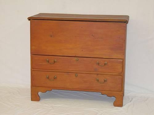EARLY NEW ENGLAND PINE LIFT TOP 2 DRAWER BLANKET CHEST W/ BOOTJACK ENDS & BAIL BRASS PULLS IN RED WASH - WEAR & IMPERFECTIONS;
