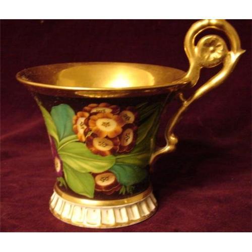 Circa 1820-1840 French Old Paris porcelain de paris very unusual highly gilded cup with a beautiful gilded handle. The handle as anyone would suspect has a restoration. Minor gild losses which just adds to its charm. Thye cup is decorated with all over flowers which are hydrangeas in many different shades of blue,pink and a plum color. The green leaves and the black background surely add to the charm of this rare piece. Good Condition other than noted. Additional images are available upon request.
