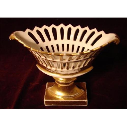 Circa 1820-1840 French Old Paris porcelain de paris very unusual highly gilded Minature Reticulated Basket. This basket actually be classified as a child's size minature as it is only 6" in height. The basket from gilded end to gilded end is 6 1/2" and the dimensions of the base is 3 3/8" X 1 7/8". Minor gild losses which just adds to its charm and enriches it's character. Excellent Condition with no breakage or restoration. Additional images are available upon request.