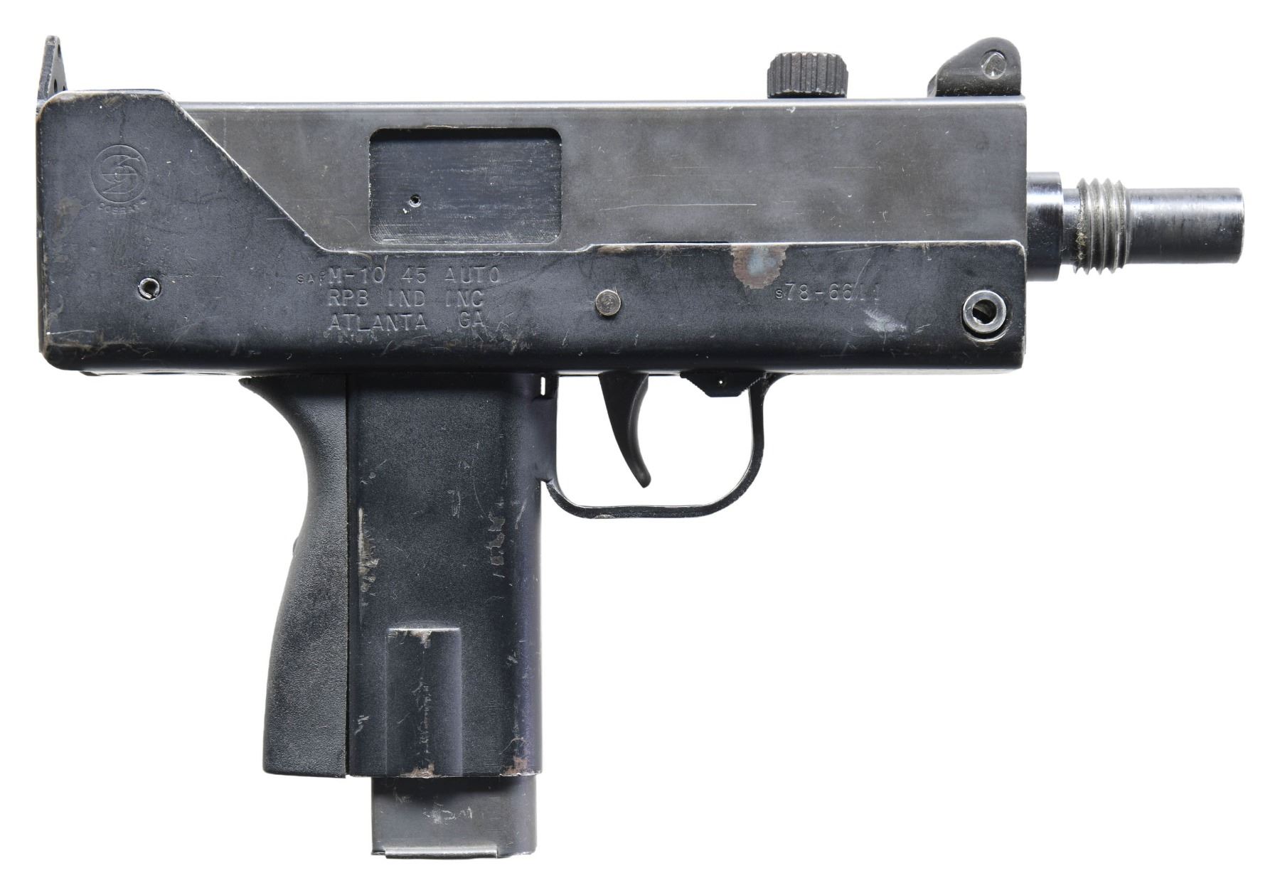 Cal. 45 ACP. S# S78-6611. Bbl. 6" threaded. An early, full-size MAC 10 semiautomatic pistol. There are very few firearms that conjure up the imagination of the general public more than the mere mention of the MAC 10. The Ingram Model 10 was originally designed in 1964. It would become the 1st of many small simplistic SMGs to contrast the expensive & labor intensive earlier variants such as the Thompson & Reising M50. Ingram’s 2 basic guidelines while designing the Model 10 "simple & cheap" while remaining effective & reliable. Made famous mostly by Hollywood, the M10 had appearances on the silver screen & on television eventually earning the infamous title of "The Gun That Made The 80’s Roar" starting w/ John Wayne utilizing a suppressed 9mm M10 in the 1974 movie "McQ". A favorite example used by the organized anti-gun movement, the Mac 10 was eventually, incorrectly & inaccurately synonymous w/ every crime committed for a long period of time. The semiautomatic M10 was originally offered as an open bolt system just like its predecessor the M10 SMG. The BATF determined that the open bolt semi autos met the criteria of a machine gun under the "readily restorable" clause & banned future manufacture, grandfathering those that were assembled and in commerce on or before June 21, 1982 under ATF ruling 82-8. Like everything else the Federal Government tells citizens they can not have, interest in these early originals immediately skyrocketed & they have been considered highly prized collectibles for over 40 years. This is an example of that early operating mechanism, before changes to a closed-bolt system were mandated. Gray parkerized finish on upper receiver w/ a black painted lower receiver. This is a factory 45ACP variant manufactured by RPB Industries in Atlanta, GA. These pistols are very similar to the SMG in both operation & aesthetics w/ only a few differences. The primary functional difference is the selector lever on the left side is absent, since it is unnecessary. Sights are a fixed protected post front, and a fixed rear peep, consisting of a raised extension of the back plate. The slotted cocking knob is nestled between the sights. Safety is in the front, right section of the trigger guard. The cocking handle also functions as a safety, where rotating it 90º locks the action. The self-loading operating system is blowback operated and fires from an open bolt. It utilizes a fixed firing pin, integral to the bolt face. Right side of receiver is marked w/ the familiar Cobray snake & globe logo and the following stamping: "SAP M-10 45 AUTO / RPB IND. INC. / ATLANTA, GA." as well as the serial number. MAGS: 1 steel 15 rd. CONDITION: Finish coverage on upper receiver remains quite complete, w/ some typical thinning, primarily on high spots & in areas of mechanical intervention. It also displays some typical drag lines often caused by stacked storage. Painted finish on lower receiver has more loss, absent in areas of some welds, and thin on high spots, w/ scattered drag lines. Shoulder stock channels opened up at rear on receiver. Bore is bright w/ strong rifling. Fire control mechanism appears to function correctly when cycled by hand. PROVENANCE: Lifelong Collection of Terrence McCarty. (24-277/JZ). MODERN. $500-900.