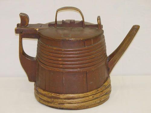EARLY PAINTED WOODEN FINGER LAPPED FLAGOON W/ HANDLE & SPOUT IN OLDER RED WASH - WEAR TO PAINT, IMPERFECTIONS