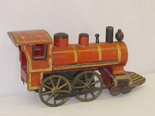 EARLY PAINTED WOODEN LOCOMOTIVE FRICTION TOY BY DAYTON TOY CO., OHIO - PAINT WEAR and LOSSES;