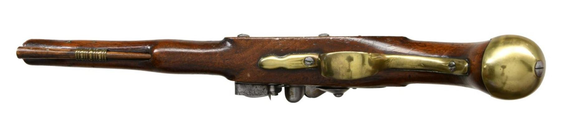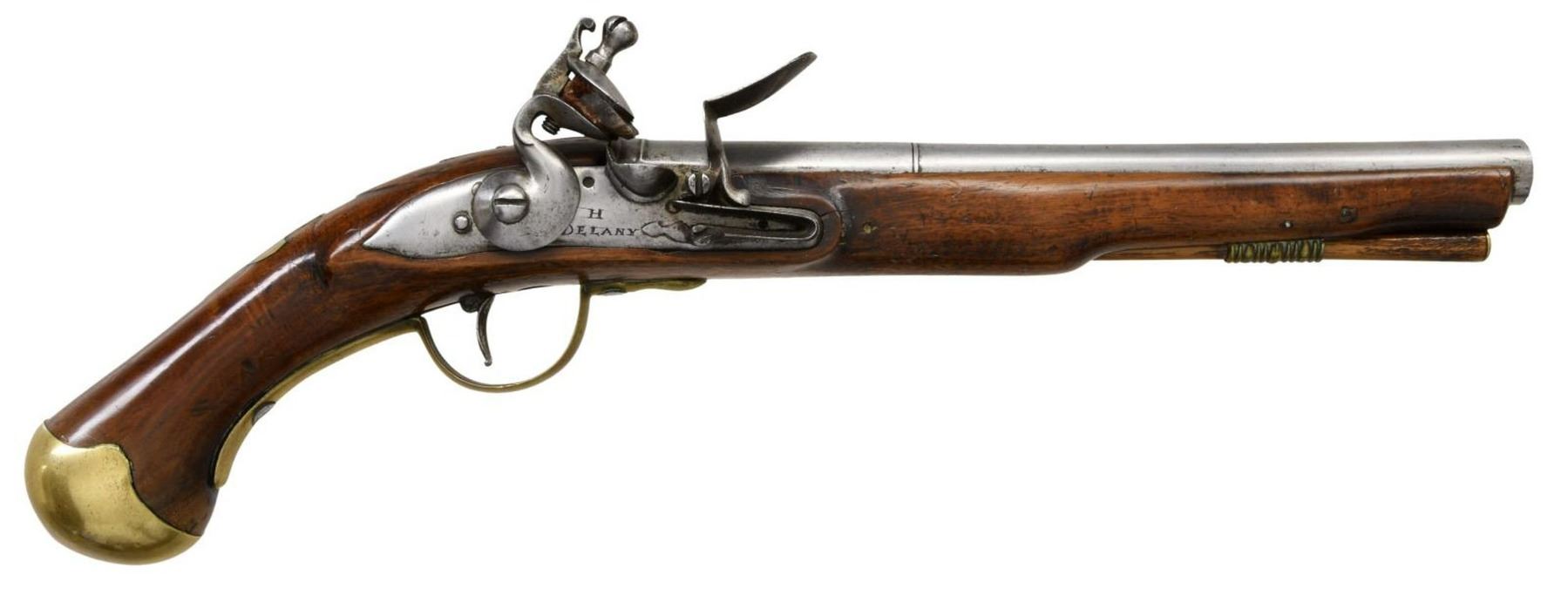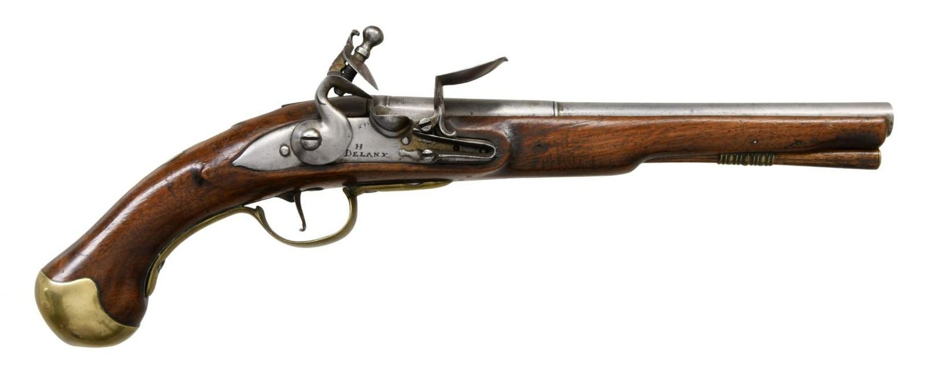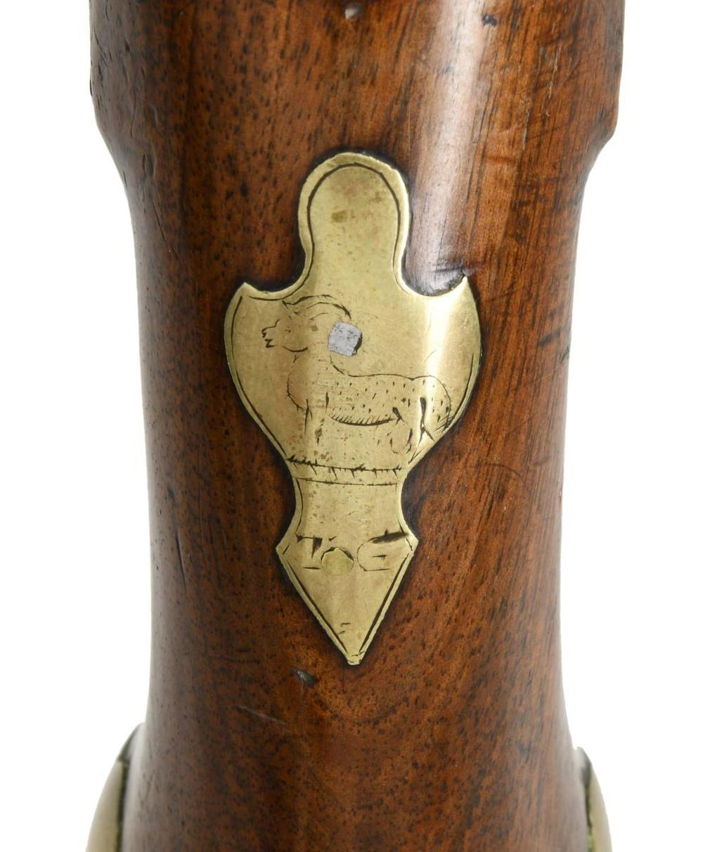 DELANY OF LONDON. Cal. 58. S# NSN. These military style pistols have 10" round tapered barrels with military type turnings at rears. London gunmaker's proofs and barrel maker's marks (indecipherable) are on left sides. Simple wedding ring transitions seperate heavier breech and slightly flared muzzles sections. Barrel tangs are secured by screws with heads under trigger guards in early style. Round bodied arched locks with broad rounded serpentine cocks have inset rounded pans, unbridled friction frizzins and feather springs with dog nose finials. "H" "Delany" is on each lockplate (Henry Delany known to be working in London 1718-1745). Stocks with early style long grips and incepient beavertails around barrel tangs extend to within 1/8" of muzzles and are pinned to barrels. Simple brass mounts consist of heavy military style butt caps, trigger guards with teardrop finials and serpentine sideplates. Shaped crest plates at tops of grips are engraved with fat tailed rams over the initials "TG". Plain hickory ramrods with brass caps mount through multi beaded pipes without metal thimbles. CONDITION: fine, professionally cleaned. Pistols are in an amazing state of preservation for their age but have been meticulously disassembled and cleaned. Iron parts presently exhibit pewter gray overall patina with scant evidence of pitting. Brass has been polished. Stocks show added oil and are fairly shiny. Only noted stock flaw is a minor repaired crack in front of lock on one pistol. Bores are very lightly pitted. Locks are almost crisp. There are no noted restored or replaced parts. These pistols are possibly unfired with only a few minor flint strikes on frizzens. (01-24098/MGM). ANTIQUE. $3,500-4,500.