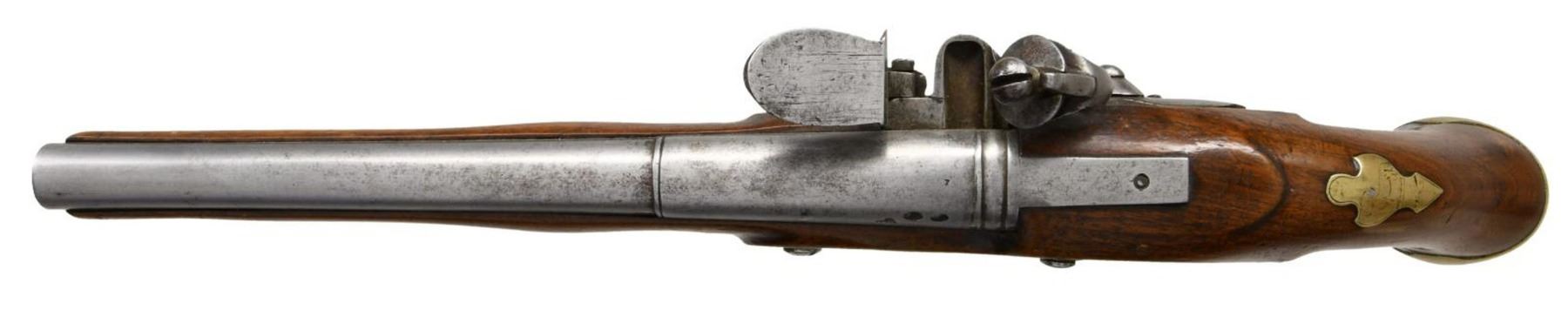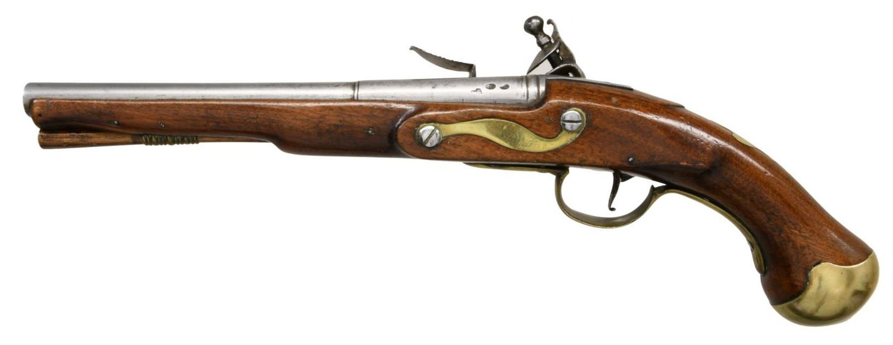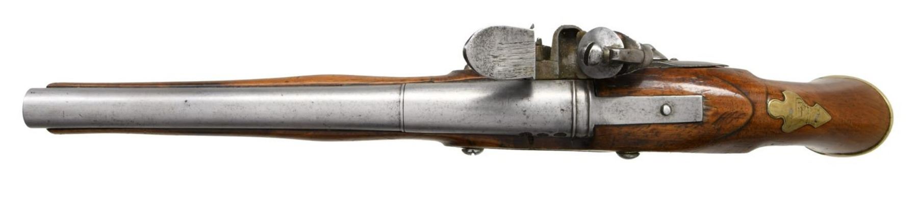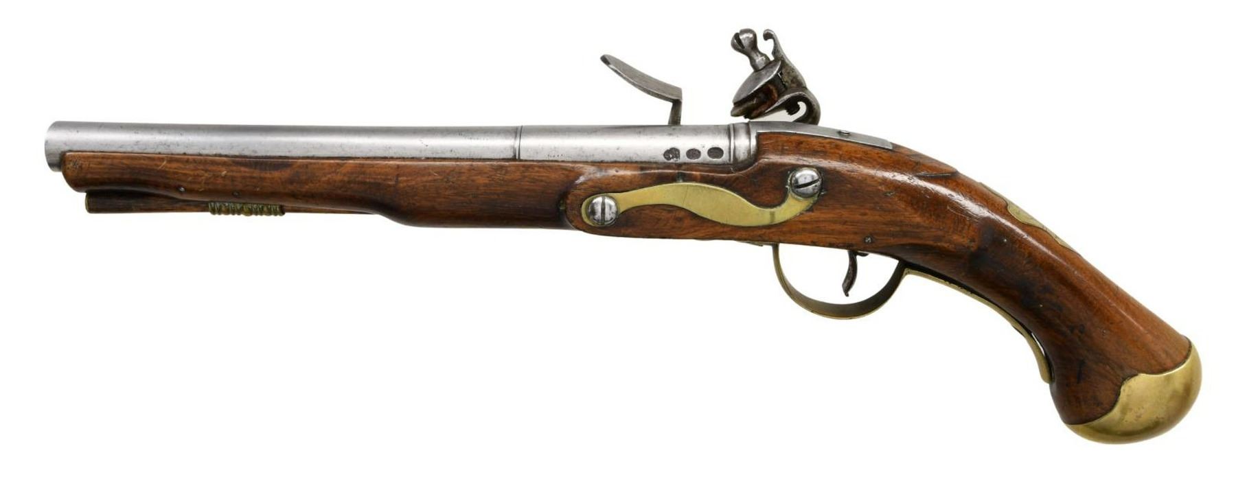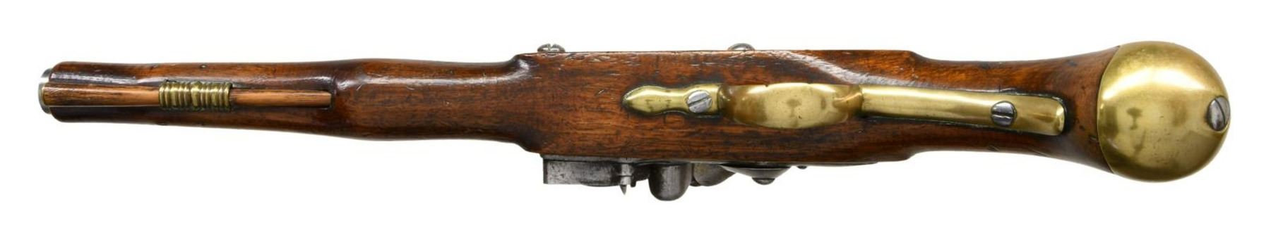 DELANY OF LONDON. Cal. 58. S# NSN. These military style pistols have 10" round tapered barrels with military type turnings at rears. London gunmaker's proofs and barrel maker's marks (indecipherable) are on left sides. Simple wedding ring transitions seperate heavier breech and slightly flared muzzles sections. Barrel tangs are secured by screws with heads under trigger guards in early style. Round bodied arched locks with broad rounded serpentine cocks have inset rounded pans, unbridled friction frizzins and feather springs with dog nose finials. "H" "Delany" is on each lockplate (Henry Delany known to be working in London 1718-1745). Stocks with early style long grips and incepient beavertails around barrel tangs extend to within 1/8" of muzzles and are pinned to barrels. Simple brass mounts consist of heavy military style butt caps, trigger guards with teardrop finials and serpentine sideplates. Shaped crest plates at tops of grips are engraved with fat tailed rams over the initials "TG". Plain hickory ramrods with brass caps mount through multi beaded pipes without metal thimbles. CONDITION: fine, professionally cleaned. Pistols are in an amazing state of preservation for their age but have been meticulously disassembled and cleaned. Iron parts presently exhibit pewter gray overall patina with scant evidence of pitting. Brass has been polished. Stocks show added oil and are fairly shiny. Only noted stock flaw is a minor repaired crack in front of lock on one pistol. Bores are very lightly pitted. Locks are almost crisp. There are no noted restored or replaced parts. These pistols are possibly unfired with only a few minor flint strikes on frizzens. (01-24098/MGM). ANTIQUE. $3,500-4,500.