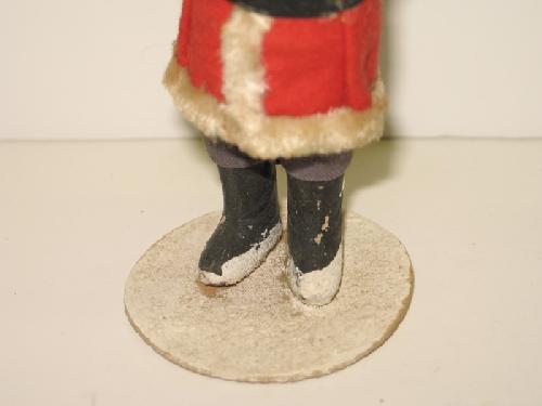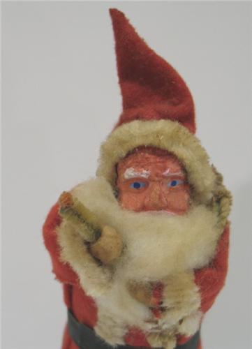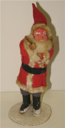 EARLY PAPIER-MÂCHÉ SANTA. Velvet coat and hat. Cloth pants. Holding partial tree. Stamped on bottom of base “Made in Japan”. 7” H