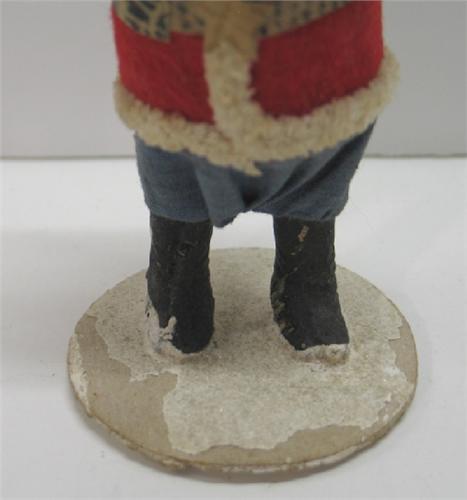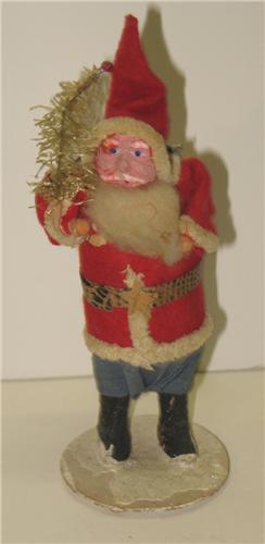 EARLY PAPIER-MÂCHÉ SANTA. Velvet coat and hat. Cloth pants. Holding tree. Stamped on bottom of base “Japan”. 6.5” H