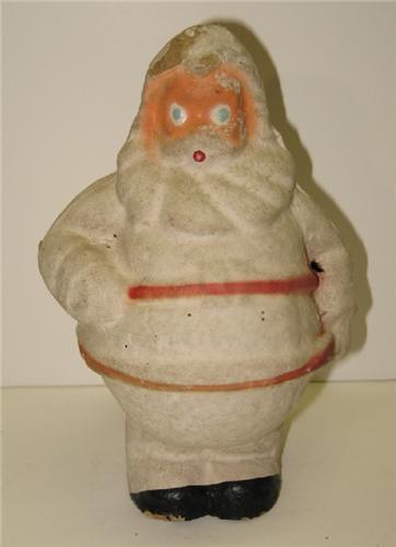 EARLY PAPIER-MÂCHÉ SANTA. Depicts Santa in white suit. Slight damage at left arm. Loss to paint at bottom of hat. 2” L horizontal slit has been cut at back of neck. 7.25” H