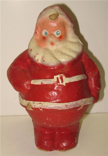 EARLY PAPIER-MÂCHÉ SANTA. Depicts Santa in red suit. Loss to paint at areas throughout. Crazing is visible throughout. 7” H