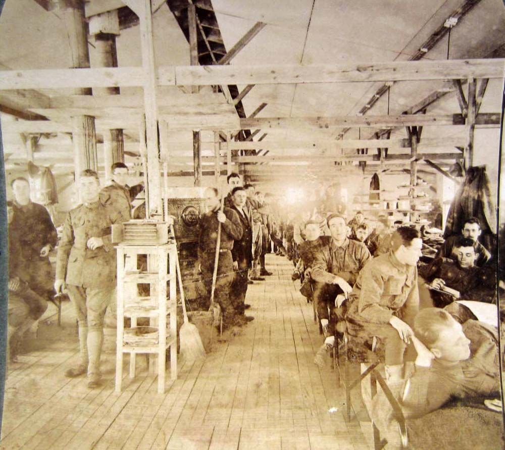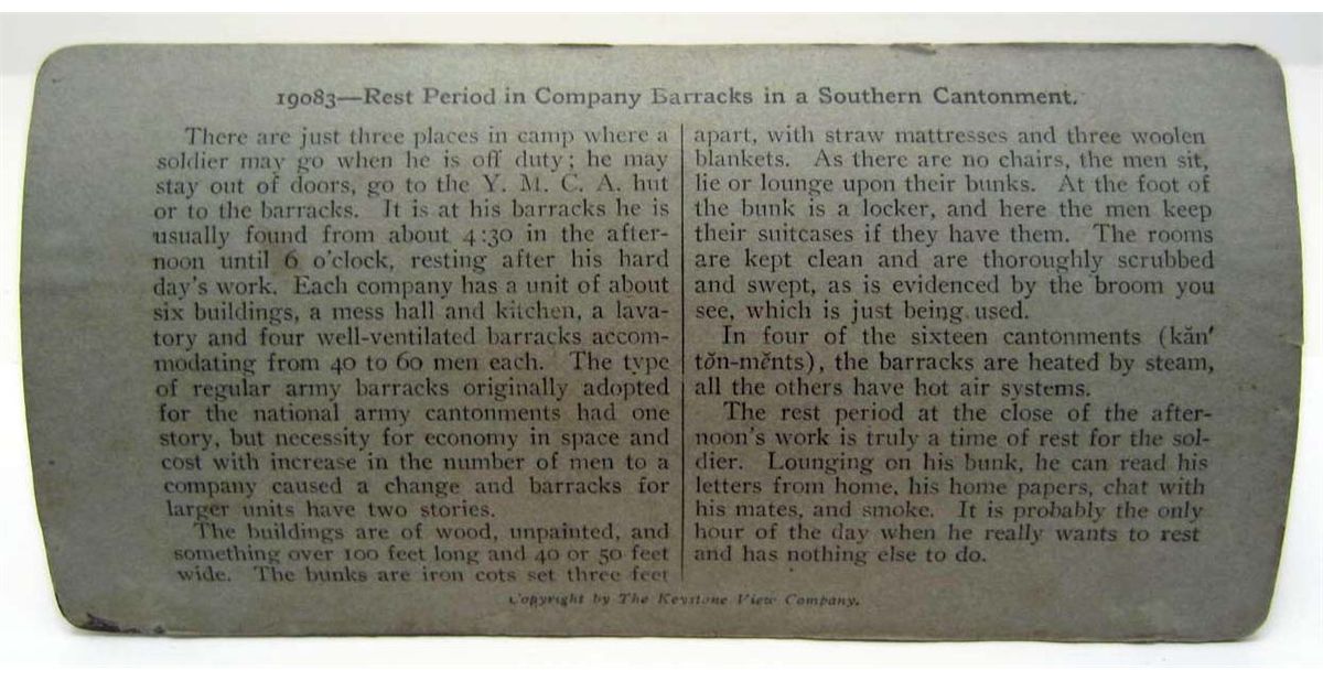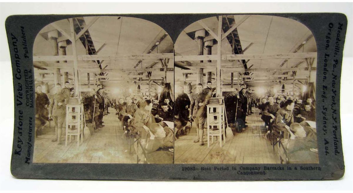 EARLY PHOTO STEREOVIEW CARD OF REST PERIOD IN COMPANY BARRACKS IN SO. CANTONMENT