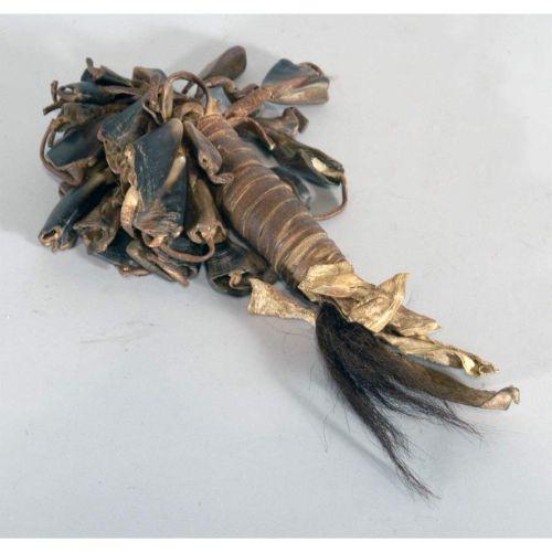 EARLY PLAINS BUFFALO DEW CLAW RATTLE 11" long, 19th century CONDITION REPORT: several claws missing, otherwise excellent. PACKING AND SHIPPING: We offer packing (double boxed in most cases) and shipping of this item within the Continental United States by USPS or UPS (our choice- boxes over 30lbs or oversized may be recalculated based on buyer's location), NOT INCLUDING INSURANCE (it will be added when we know the sales price) for $30