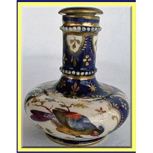 Very early jeweled cobalt blue and gold porcelaine perfume / scent bottle with handpainted bird & flowers. English, possibly early Derby, 18th to early 19th century.