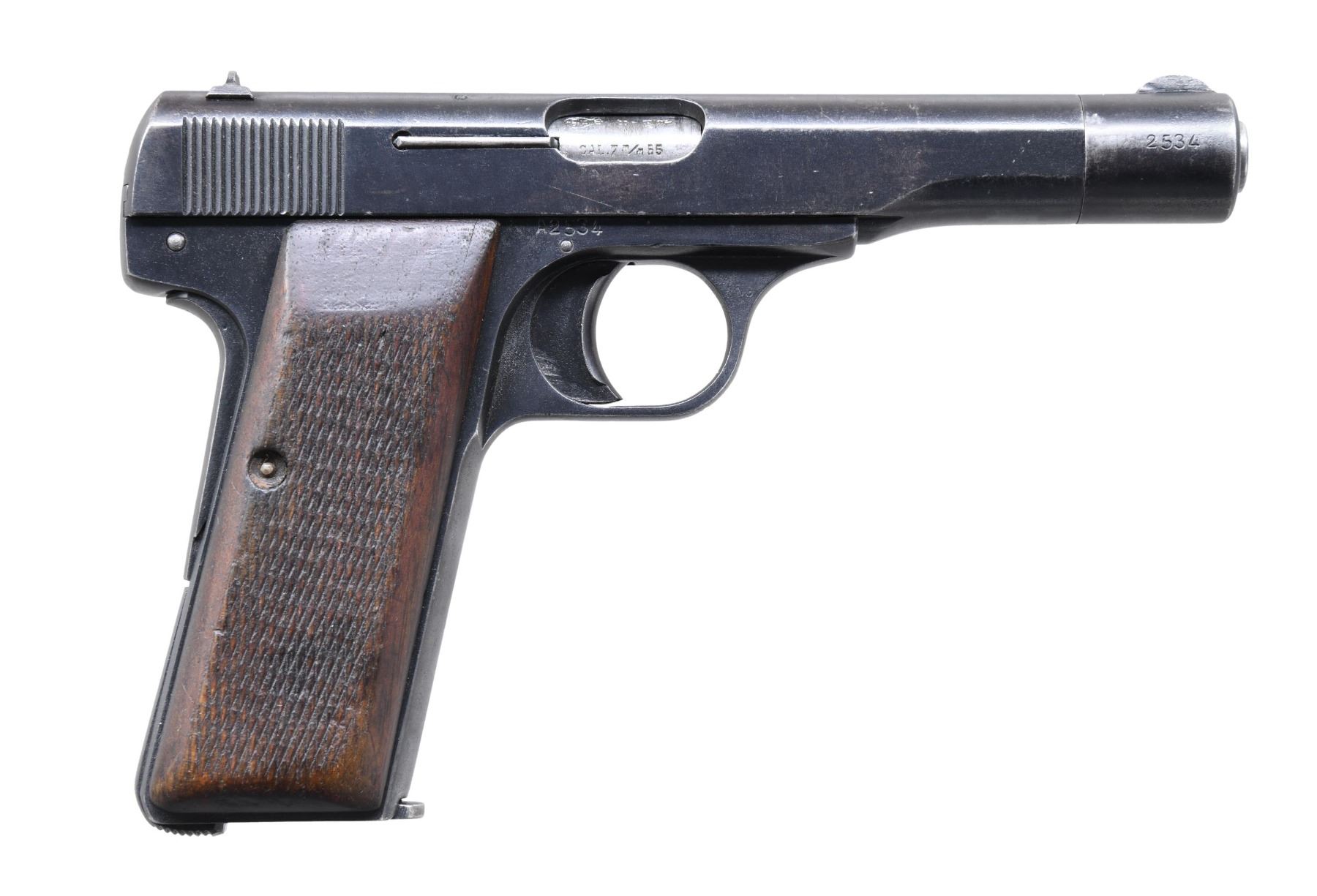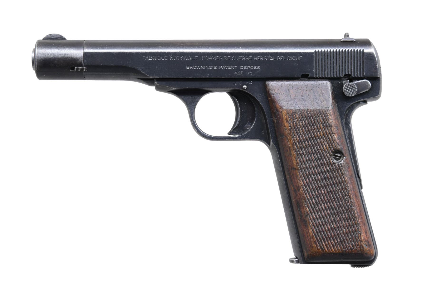 SEMI-AUTOMATIC PISTOL. Cal. 7.65mm. S# A2534. Bbl. 4 3/8". Model 1922 semi-automatic pistol mfg. by FN likely just after the liberation of Belgium. These "A" prefix pistols were quickly assembled from remaining occupation and/or hidden pre-occupation parts by returning FN employees shortly after the German forces left the FN factory in September of 1944. The exact recipients of these "A" prefix pistols are unknown, as no records were kept during this period. This example is marked "FABRIQUE NATIONALE D'ARMES DE GUERRE HERSTAL BELGIQUE/ BROWNING'S PATENT DEPOSE" on the left side of the slide. Frame and slide exhibit Belgian commercial proofs. Bbl. exhibits Belgian commercial proofs on the right, with a faint German eagle proof present on the left. Right side of the frame is marked with the S# "A2534". Metal components exhibit an older reapplied blue finish overall, save for on the bbl., which remains polished in-the-white. Frame is mounted with 2-piece checkered wood grips. Half-moon blade front sight, with V-notch rear sight. All serialized parts are matching and include the frame, slide (interior), and bbl. (left side of chamber). MAGS: 1 8-rd. CONDITION: very good, as refinished, with metal components retaining the majority of their reapplied blue finish, exhibiting some wear and thinning that shows through to gray patina, some scattered superficial handling marks, as well as areas of pitting that are present beneath the bluing. Mirror bore, exhibiting a few spots of light pitting, while retaining well defined rifling throughout. Grips show some smoothing, as well as some scattered superficial marks from handling and storage, but otherwise remain sturdy and serviceable. An intriguing example of an early post-liberation FN Model 1922. PROVENANCE: The Estate Collection of Charles Wagner. (25-335/MLW). CURIO. $300-400.