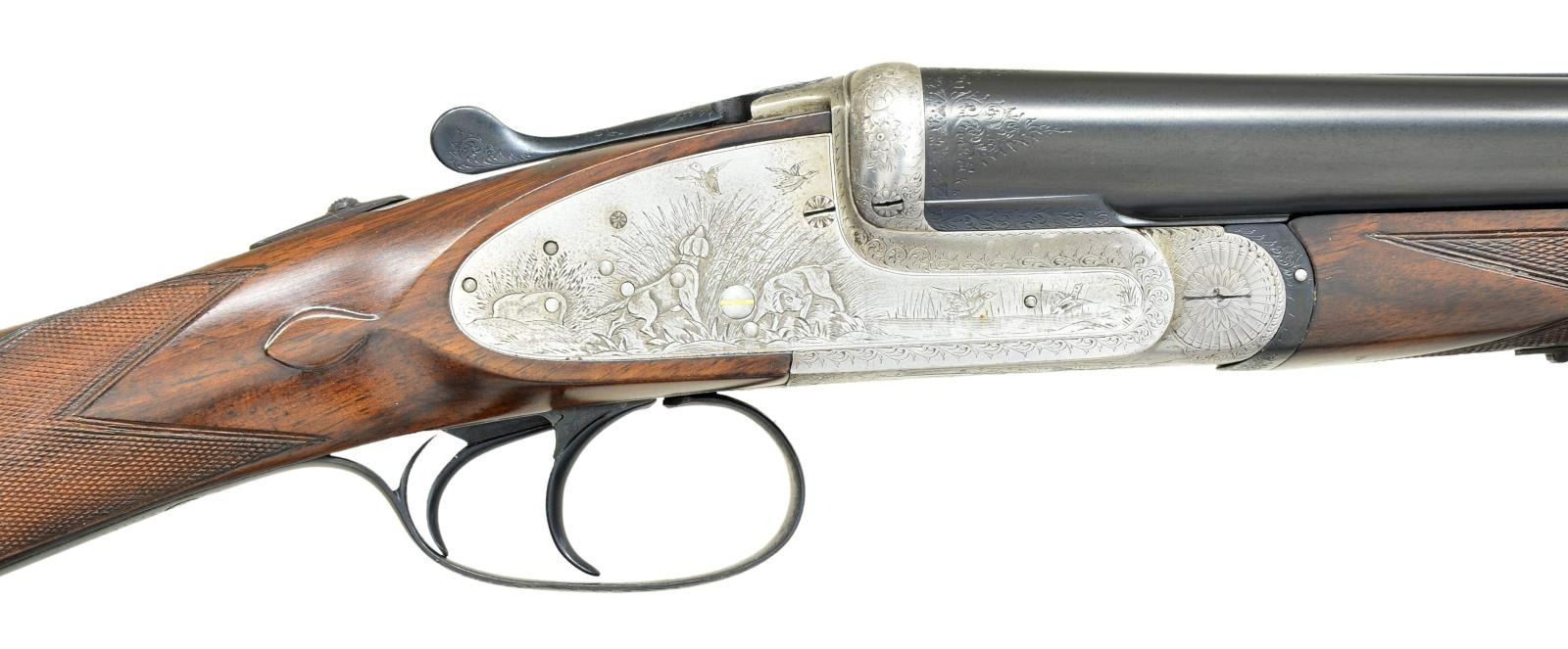 HEAVY GAME GUN WITH GAME SCENE ENGRAVING. Cal. 12 Ga., 2 3/4". S# 84346. 27 5/8" Chopperlump bbls. with matted game rib are engraved w/ maker's name and address on tops. There are 1" triangles of scroll engraving at breech ends. Bbl. flats are stamped w/ 1945 Spanish Nitro proofs for 2 3/4" chambers. A sling loop is screwed to bottom rib. Coin finished sidelock action features automatic safety, hidden third fastener, bushed strikers, gold line tumbler end cocking indicators and double triggers (front articulated). Action is engraved w/ sm. scroll w/ rose bouquet highlights surrounding scene of eagle making off w/ lamb on bottom. Sideplates are fully engraved with game scenes depicting a pair of pointers and pheasant on left lock with a pair of setters watching four grouse depart on right. Portrait of a spaniel retrieving a rabbit is on trigger guard bow. Well marbled European walnut straight grip buttstock measures 14 1/2" over brown open sided pad. Stock features drop points, closely spaced point pattern grip checkering and a sling loop. Matching splinter ejector forend w/ Anson release has interesting switch to deactivate ejectors. MEASUREMENTS: BBLS: Bore Diameter: R .725", L .727". Restriction: R . 017" (MOD), L .035" (FULL). Min. Wall Thickness: R .029", L .026". STOCK: DAH: 2 3/8". DAC: 1 1/2". LOP: 14 1/2". CAST: approx. 1/2" on. WEIGHT: 6 lb. 15 oz. CONDITION: good as refinished. There are only a few marks in new blue of bbls. Engraving is soft. Action cleaned to coin finish. Stocks with nearly all shiny oil refinish., checkering recut. Bores are shiny with evidence of cleaning over light pitting throughout. Action is tight. Ejectors are in time. Ejector selector inoperable; ejectors trip in either position. (22-4521/MGM). CURIO. $900-1,400.