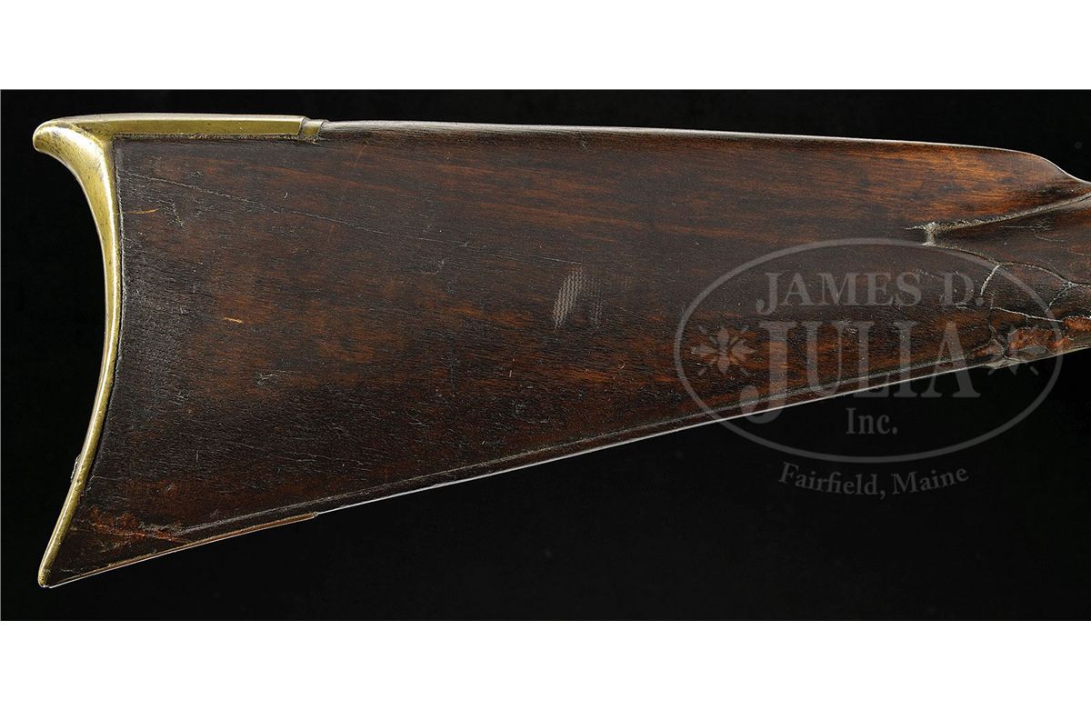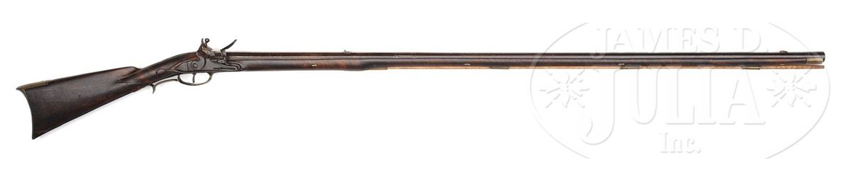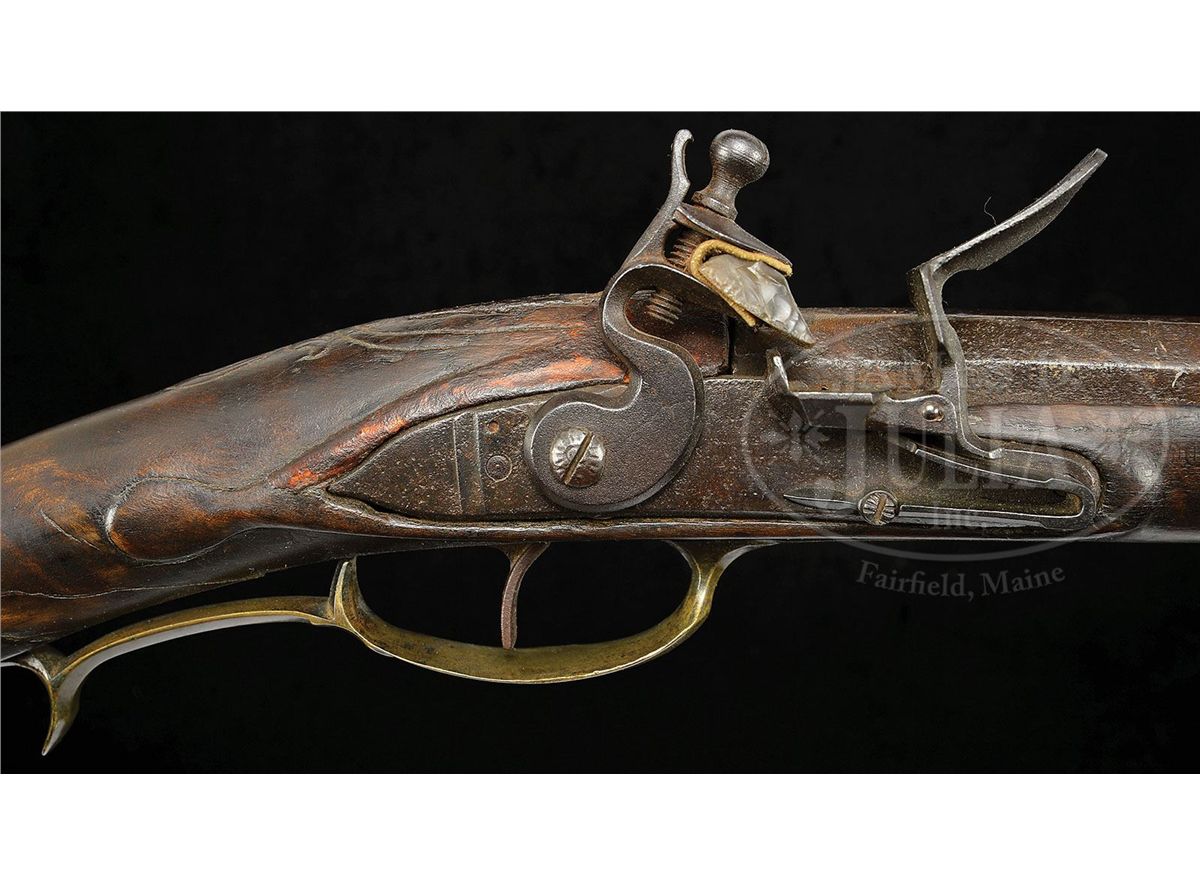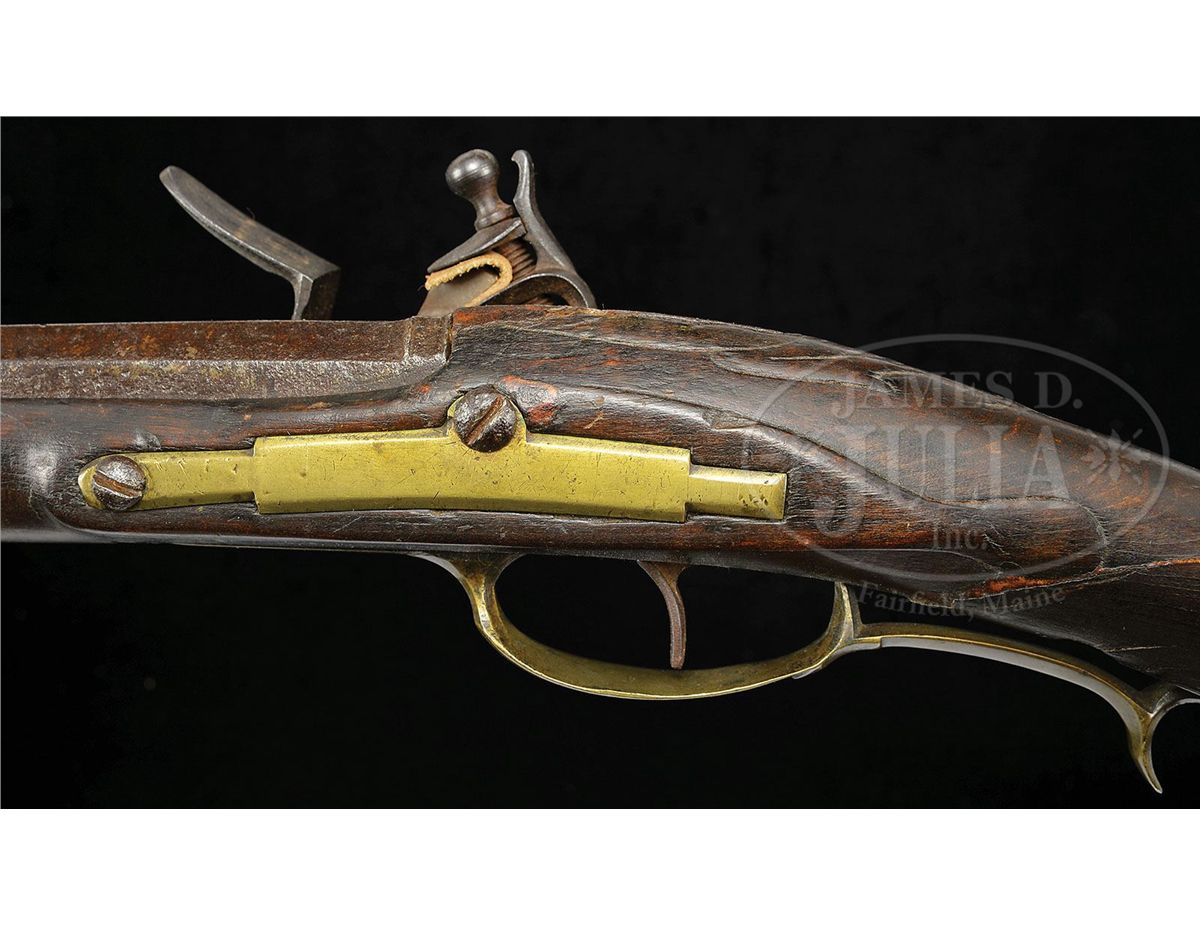 NSN. 47-1/4" oct to round flared 58 Cal. smooth bbl. This early buck and ball gun has deep and crisp incised and relief carving in front of and behind the cheekpiece. Carving extends around to the lock side of the wrist. Gun is nicely carved around the bbl tang. Heavy beveled brass sideplate and butt carving suggest George Schroyer as the possible maker of this early gun. Ramrod is supported by four ramrod pipes and the gun has a hand-forged German lock. George Schroyer worked in York and Franklin Counties from the late 1700's into the 1815 period. George Schroyer made beautiful Kentuckys before, during, and after the Revolutionary War. His carving is strong and vigorous. CONDITION: This gun is in good original condition throughout with the exception that it has an old break through the wrist which was probably stabilized in period. The lock may be a reconversion. 4-48332 RG57