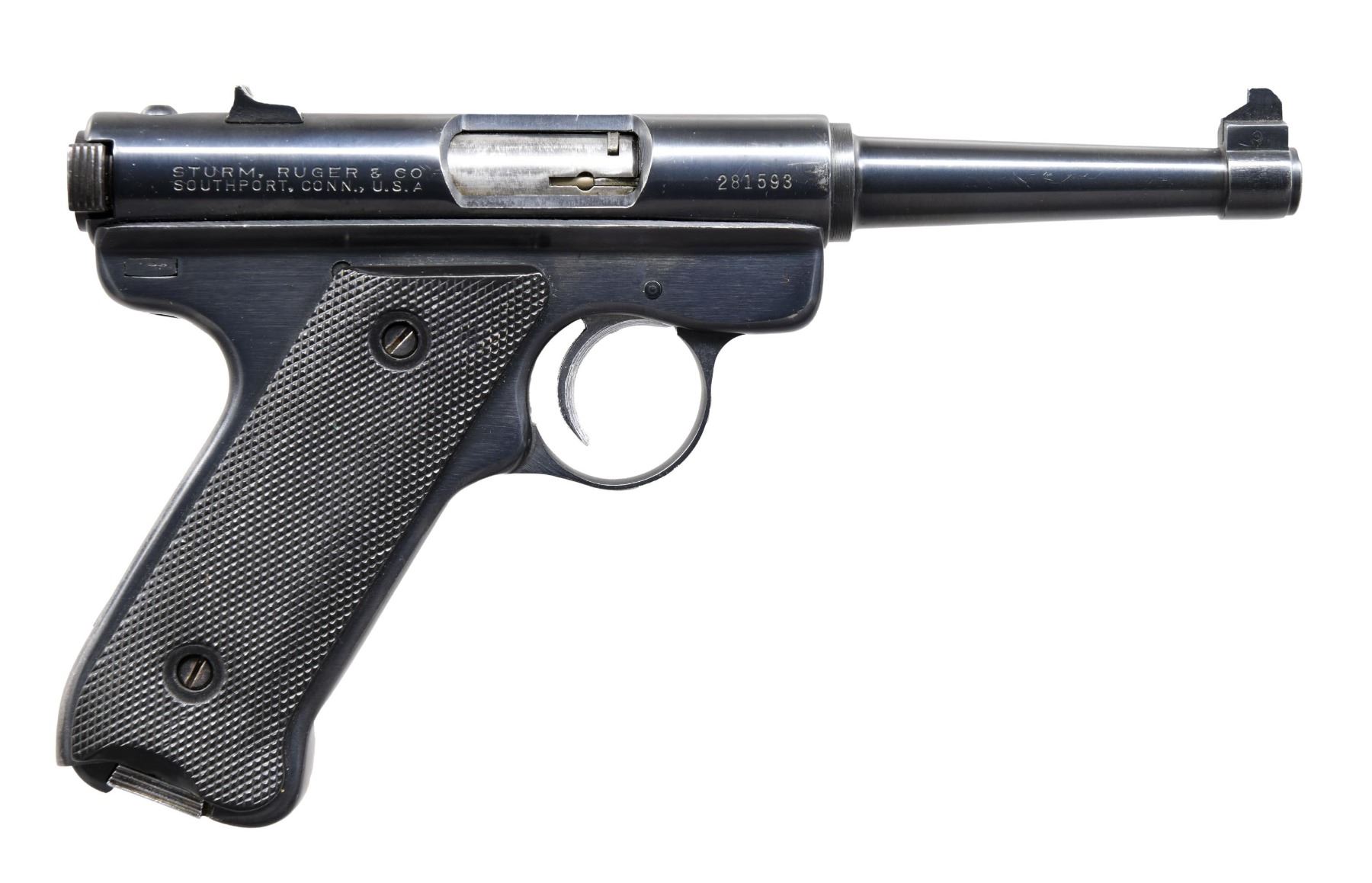 Cal. 22 LR. S# 281593. Bbl. 4 3/4" with pinned Patridge blade front sight; drift adjustable rear sight on rear of receiver. Mfg. 1965 (1949-1982 for Standard Autos) with early correct checkered hard rubber grips with black eagle medallion on left. MAGS: 1 factory 9 rd.; correct early type with charging slot on right side only. CONDITION: very good to excellent appearance with factory quality refinish having slightly more polish than standard. Very slight thinning at forward edges of receiver and barrel. Near excellent bore and grips. (24-5631/NW). CURIO. $200-300.