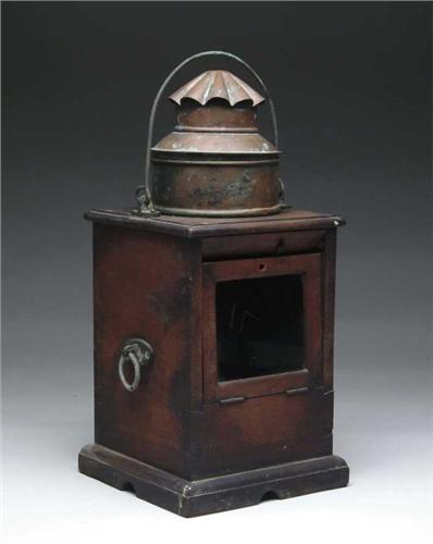EARLY SHIP’S WOOD AND COPPER BINNACLE. Dovetailed case in original finish with brass side ring handles, molded base and copper removable top. Original burner is present. Ready for your small compass. SIZE: 20” h x 9-1/2” sq. CONDITION: Generally very good, no compass. 9-27704
