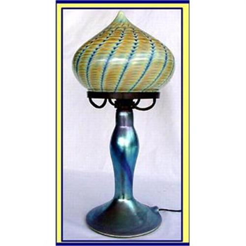 A good Lundberg iridescent glass lamp.<BR>Measures 18inches high.<BR>Very beautiful blue and gold iridescent glass. The round foot of the base has a domed lip for the wire to pass through without unbalancing the lamp. Superb shades from gold to purple with every tone of blue conceivable swirl up the long stand of the base. <BR>The top of the base has a metal ring with curved scrolls, very Arts & Crafts in taste.<BR>The shade is 8 1/2inches accross at widest point. It is mushroom shaped with blue and gold zipper pattern. <BR>Inside the glass rim is signed LUNDBERG STUDIOS 1981 and 150512/17.<BR>Inside metal of base has inscribed 18 1/2.<BR>Condition of all parts is excellent. No damage of any sort.