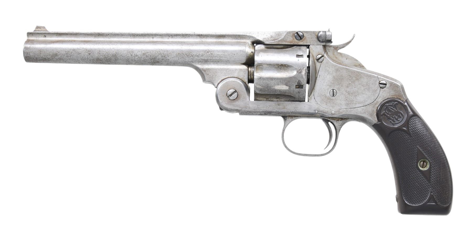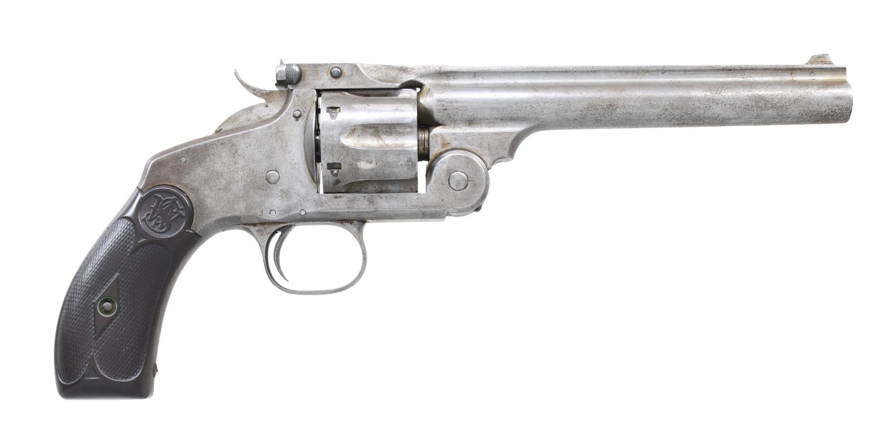 Please note as of 5/6/25 this item description has been updated. Please revisit this description and contact us with any questions. Cal. 32-44 S&W (32 S&W Long). S# 65. Bbl. 6 1/2". Blade front sight. V-notch rear sight. Matching numbers on frame & cyl. Bbl. number is illegible due to old oxidation. Grips are scratch numbered matching to gun. Early S&W New Model 3 with very low serial number & moderate knuckle on backstrap. Metal has a silvery-gray appearance. Checkered brown hard rubber grips with S&W monograms. Altered hammer spur. CONDITION: top of left grip panel has repaired crack across it, grips otherwise show some checkering wear, scratches & handling marks. Metal is a silvery-gray color with scattered oxidation & light pitting. Cyl. rotates slightly when trigger is pulled but action is otherwise functional when hand cycled. Bore shows scattered notable pitting patches but visible rifling. (01-26853/MJC). ANTIQUE. $1000-1500.